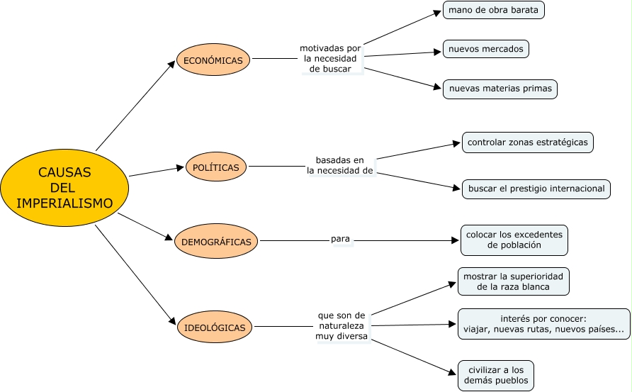 Este Cmap, tiene información relacionada con: Causas del Imperialismo del siglo XIX, IDEOLÓGICAS que son de naturaleza muy diversa interés por conocer: viajar, nuevas rutas, nuevos países..., CAUSAS DEL IMPERIALISMO POLÍTICAS, POLÍTICAS basadas en la necesidad de buscar el prestigio internacional, CAUSAS DEL IMPERIALISMO DEMOGRÁFICAS, DEMOGRÁFICAS para colocar los excedentes de población, ECONÓMICAS motivadas por la necesidad de buscar nuevas materias primas, POLÍTICAS basadas en la necesidad de controlar zonas estratégicas, CAUSAS DEL IMPERIALISMO ECONÓMICAS, CAUSAS DEL IMPERIALISMO IDEOLÓGICAS, IDEOLÓGICAS que son de naturaleza muy diversa mostrar la superioridad de la raza blanca, IDEOLÓGICAS que son de naturaleza muy diversa civilizar a los demás pueblos, ECONÓMICAS motivadas por la necesidad de buscar mano de obra barata, ECONÓMICAS motivadas por la necesidad de buscar nuevos mercados
