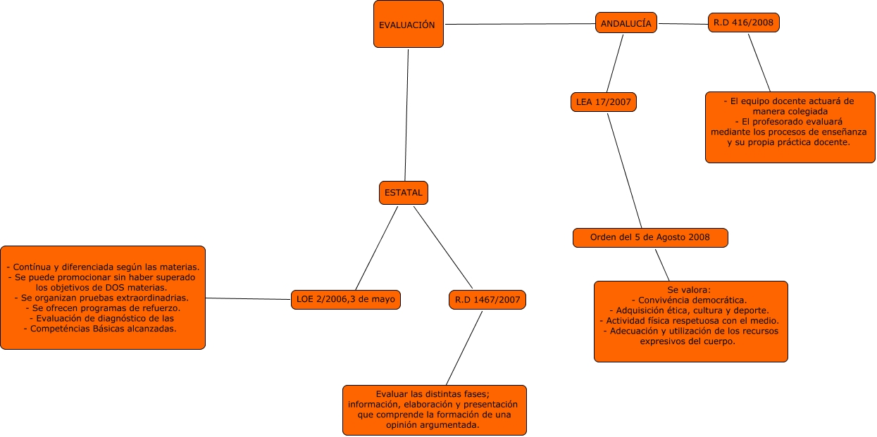 Este Cmap, tiene información relacionada con: EVALUACIÓN, ANDALUCÍA ???? LEA 17/2007, R.D 416/2008 ???? - El equipo docente actuará de manera colegiada - El profesorado evaluará mediante los procesos de enseñanza y su propia práctica docente., R.D 1467/2007 ???? Evaluar las distintas fases; información, elaboración y presentación que comprende la formación de una opinión argumentada., LEA 17/2007 ???? Orden del 5 de Agosto 2008, ANDALUCÍA ???? R.D 416/2008, ESTATAL ???? R.D 1467/2007, EVALUACIÓN ???? ESTATAL, LOE 2/2006,3 de mayo ???? - Contínua y diferenciada según las materias. - Se puede promocionar sin haber superado los objetivos de DOS materias. - Se organizan pruebas extraordinadrias. - Se ofrecen programas de refuerzo. - Evaluación de diagnóstico de las - Competéncias Básicas alcanzadas., Orden del 5 de Agosto 2008 ???? Se valora: - Convivéncia democrática. - Adquisición ética, cultura y deporte. - Actividad física respetuosa con el medio. - Adecuación y utilización de los recursos expresivos del cuerpo., ESTATAL ???? LOE 2/2006,3 de mayo, EVALUACIÓN ???? ANDALUCÍA