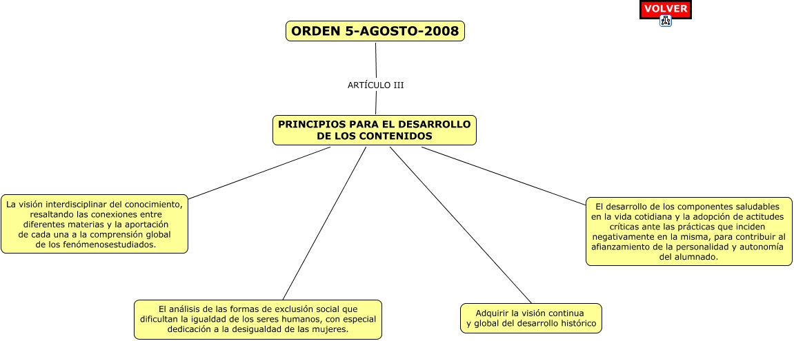 Este Cmap, tiene información relacionada con: ORDEN 5-AGOSTO-2008 PRICIPIOS, PRINCIPIOS PARA EL DESARROLLO DE LOS CONTENIDOS ???? El desarrollo de los componentes saludables en la vida cotidiana y la adopción de actitudes críticas ante las prácticas que inciden negativamente en la misma, para contribuir al afianzamiento de la personalidad y autonomía del alumnado., ORDEN 5-AGOSTO-2008 ARTÍCULO III PRINCIPIOS PARA EL DESARROLLO DE LOS CONTENIDOS, PRINCIPIOS PARA EL DESARROLLO DE LOS CONTENIDOS ???? El análisis de las formas de exclusión social que dificultan la igualdad de los seres humanos, con especial dedicación a la desigualdad de las mujeres., PRINCIPIOS PARA EL DESARROLLO DE LOS CONTENIDOS ???? Adquirir la visión continua y global del desarrollo histórico, PRINCIPIOS PARA EL DESARROLLO DE LOS CONTENIDOS ???? La visión interdisciplinar del conocimiento, resaltando las conexiones entre diferentes materias y la aportación de cada una a la comprensión global de los fenómenosestudiados.