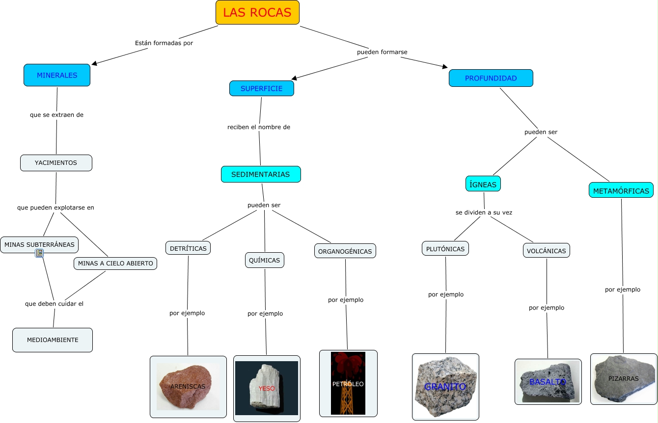 Este Cmap, tiene información relacionada con: las_rocas, LAS ROCAS pueden formarse PROFUNDIDAD, SEDIMENTARIAS pueden ser QUÍMICAS, ÍGNEAS se dividen a su vez PLUTÓNICAS, VOLCÁNICAS por ejemplo BASALTO, YACIMIENTOS que pueden explotarse en MINAS SUBTERRÁNEAS, METAMÓRFICAS por ejemplo PIZARRAS, LAS ROCAS pueden formarse SUPERFICIE, SEDIMENTARIAS pueden ser ORGANOGÉNICAS, ÍGNEAS se dividen a su vez VOLCÁNICAS, MINAS SUBTERRÁNEAS que deben cuidar el MEDIOAMBIENTE, PLUTÓNICAS por ejemplo GRANITO, YACIMIENTOS que pueden explotarse en MINAS A CIELO ABIERTO, SEDIMENTARIAS pueden ser DETRÍTICAS, MINERALES que se extraen de YACIMIENTOS, MINAS A CIELO ABIERTO que deben cuidar el MEDIOAMBIENTE, PROFUNDIDAD pueden ser METAMÓRFICAS, ORGANOGÉNICAS por ejemplo PETRÓLEO, QUÍMICAS por ejemplo YESO, DETRÍTICAS por ejemplo ARENISCAS, LAS ROCAS Están formadas por MINERALES