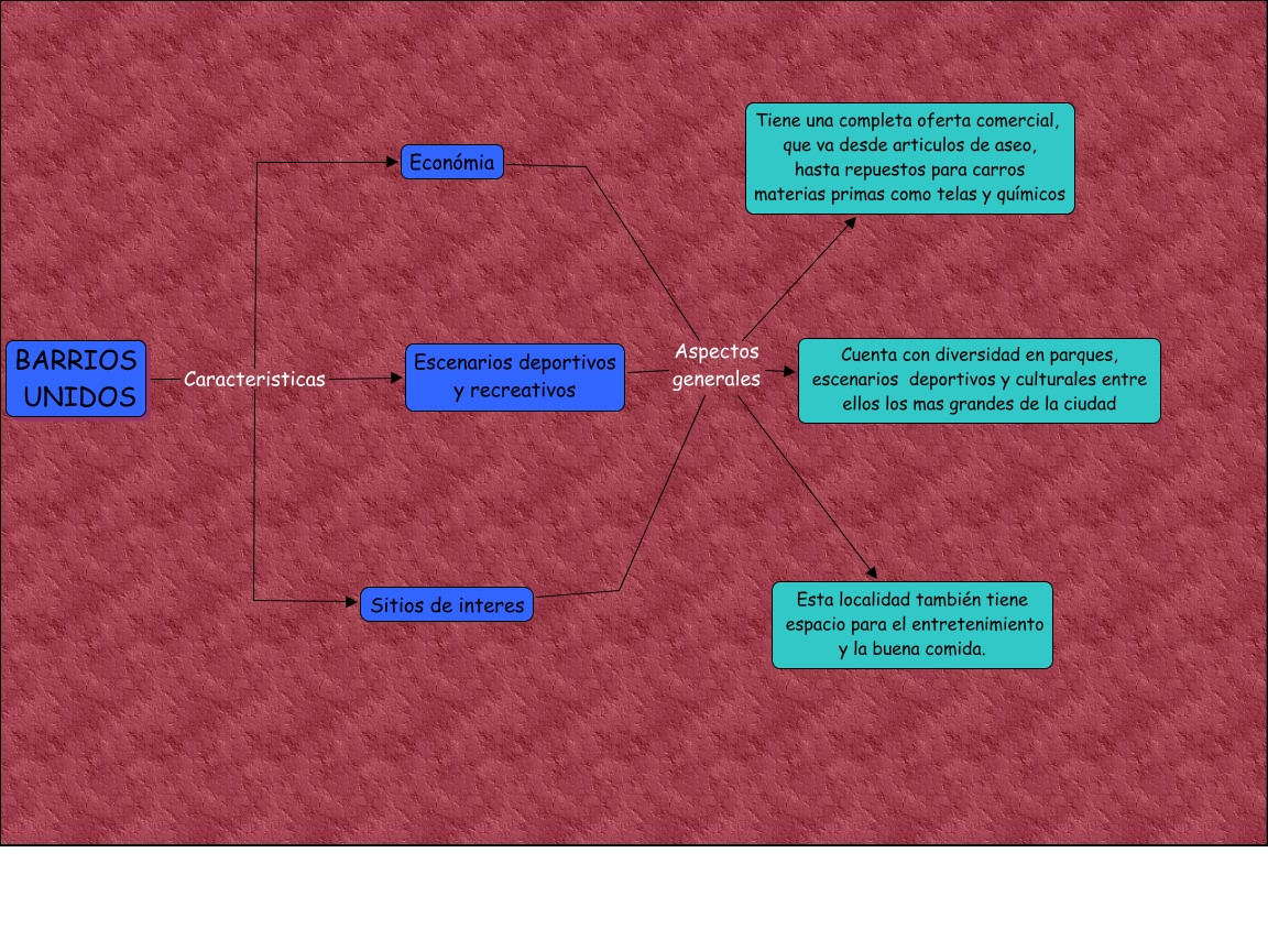 Este Cmap, tiene información relacionada con: Caracteristicas Barrio Unidos, BARRIOS UNIDOS Caracteristicas Económia, Escenarios deportivos y recreativos Aspectos generales Cuenta con diversidad en parques, escenarios deportivos y culturales entre ellos los mas grandes de la ciudad, BARRIOS UNIDOS Caracteristicas Sitios de interes, Económia Aspectos generales Tiene una completa oferta comercial, que va desde articulos de aseo, hasta repuestos para carros materias primas como telas y químicos, Sitios de interes Aspectos generales Esta localidad también tiene espacio para el entretenimiento y la buena comida., BARRIOS UNIDOS Caracteristicas Escenarios deportivos y recreativos