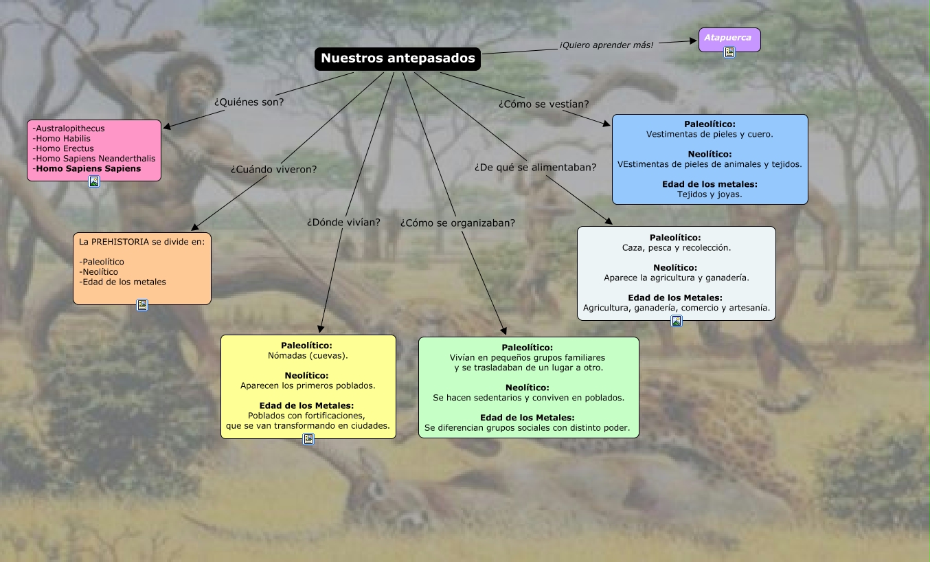 Este Cmap, tiene información relacionada con: Nuestros antepasados, Nuestros antepasados ¿Cómo se organizaban? Paleolítico: Vivían en pequeños grupos familiares y se trasladaban de un lugar a otro. Neolítico: Se hacen sedentarios y conviven en poblados. Edad de los Metales: Se diferencian grupos sociales con distinto poder., Nuestros antepasados ¡Quiero aprender más! Atapuerca, Nuestros antepasados ¿Cómo se vestían? Paleolítico: Vestimentas de pieles y cuero. Neolítico: VEstimentas de pieles de animales y tejidos. Edad de los metales: Tejidos y joyas., Nuestros antepasados ¿Cuándo viveron? La PREHISTORIA se divide en: -Paleolítico -Neolítico -Edad de los metales, Nuestros antepasados ¿Dónde vivían? Paleolítico: Nómadas (cuevas). Neolítico: Aparecen los primeros poblados. Edad de los Metales: Poblados con fortificaciones, que se van transformando en ciudades., Nuestros antepasados ¿Quiénes son? -Australopithecus -Homo Habilis -Homo Erectus -Homo Sapiens Neanderthalis -Homo Sapiens Sapiens, Nuestros antepasados ¿De qué se alimentaban? Paleolítico: Caza, pesca y recolección. Neolítico: Aparece la agricultura y ganadería. Edad de los Metales: Agricultura, ganadería, comercio y artesanía.