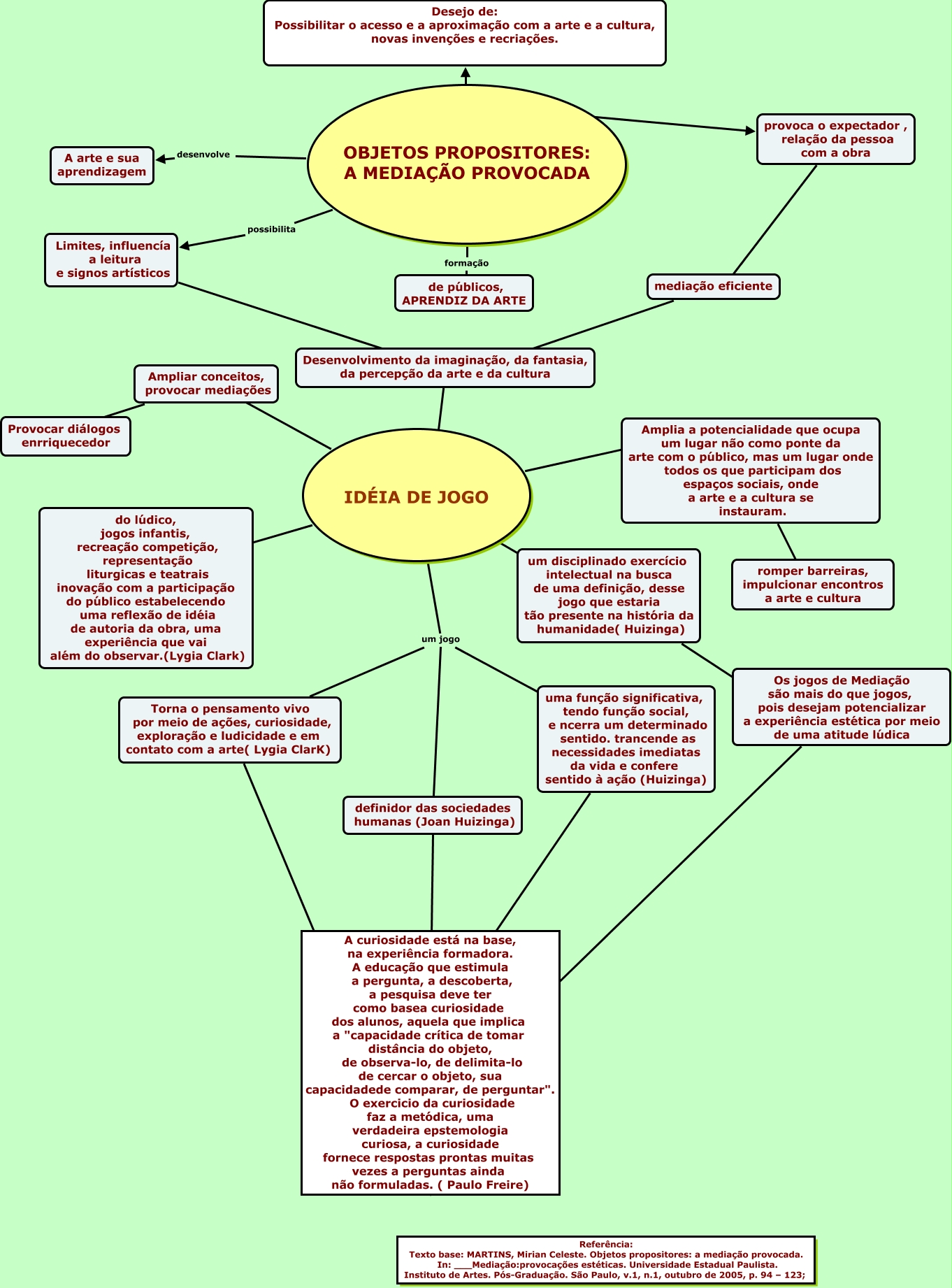 Este Mapa Conceitual tem informações relacionadas a: objetos propositório, OBJETOS PROPOSITORES: A MEDIAÇÃO PROVOCADA ???? Desejo de: Possibilitar o acesso e a aproximação com a arte e a cultura, novas invenções e recriações., IDÉIA DE JOGO ???? Amplia a potencialidade que ocupa um lugar não como ponte da arte com o público, mas um lugar onde todos os que participam dos espaços sociais, onde a arte e a cultura se instauram., IDÉIA DE JOGO ???? um disciplinado exercício intelectual na busca de uma definição, desse jogo que estaria tão presente na história da humanidade( Huizinga), uma função significativa, tendo função social, e ncerra um determinado sentido. trancende as necessidades imediatas da vida e confere sentido à ação (Huizinga) ???? A curiosidade está na base, na experiência formadora. A educação que estimula a pergunta, a descoberta, a pesquisa deve ter como basea curiosidade dos alunos, aquela que implica a "capacidade crítica de tomar distância do objeto, de observa-lo, de delimita-lo de cercar o objeto, sua capacidadede comparar, de perguntar". O exercicio da curiosidade faz a metódica, uma verdadeira epstemologia curiosa, a curiosidade fornece respostas prontas muitas vezes a perguntas ainda não formuladas. ( Paulo Freire), Desenvolvimento da imaginação, da fantasia, da percepção da arte e da cultura ???? IDÉIA DE JOGO, IDÉIA DE JOGO um jogo definidor das sociedades humanas (Joan Huizinga), Os jogos de Mediação são mais do que jogos, pois desejam potencializar a experiência estética por meio de uma atitude lúdica ???? A curiosidade está na base, na experiência formadora. A educação que estimula a pergunta, a descoberta, a pesquisa deve ter como basea curiosidade dos alunos, aquela que implica a "capacidade crítica de tomar distância do objeto, de observa-lo, de delimita-lo de cercar o objeto, sua capacidadede comparar, de perguntar". O exercicio da curiosidade faz a metódica, uma verdadeira epstemologia curiosa, a curiosidade fornece respostas prontas muitas vezes a perguntas ainda não formuladas. ( Paulo Freire), OBJETOS PROPOSITORES: A MEDIAÇÃO PROVOCADA ???? provoca o expectador , relação da pessoa com a obra, OBJETOS PROPOSITORES: A MEDIAÇÃO PROVOCADA possibilita Limites, influencía a leitura e signos artísticos, IDÉIA DE JOGO ???? do lúdico, jogos infantis, recreação competição, representação liturgicas e teatrais inovação com a participação do público estabelecendo uma reflexão de idéia de autoria da obra, uma experiência que vai além do observar.(Lygia Clark), Torna o pensamento vivo por meio de ações, curiosidade, exploração e ludicidade e em contato com a arte( Lygia ClarK) ???? A curiosidade está na base, na experiência formadora. A educação que estimula a pergunta, a descoberta, a pesquisa deve ter como basea curiosidade dos alunos, aquela que implica a "capacidade crítica de tomar distância do objeto, de observa-lo, de delimita-lo de cercar o objeto, sua capacidadede comparar, de perguntar". O exercicio da curiosidade faz a metódica, uma verdadeira epstemologia curiosa, a curiosidade fornece respostas prontas muitas vezes a perguntas ainda não formuladas. ( Paulo Freire), mediação eficiente ???? Desenvolvimento da imaginação, da fantasia, da percepção da arte e da cultura, Ampliar conceitos, provocar mediações ???? Provocar diálogos enrriquecedor, Ampliar conceitos, provocar mediações ???? Provocar diálogos enrriquecedor, OBJETOS PROPOSITORES: A MEDIAÇÃO PROVOCADA desenvolve A arte e sua aprendizagem, IDÉIA DE JOGO um jogo uma função significativa, tendo função social, e ncerra um determinado sentido. trancende as necessidades imediatas da vida e confere sentido à ação (Huizinga), IDÉIA DE JOGO um jogo Torna o pensamento vivo por meio de ações, curiosidade, exploração e ludicidade e em contato com a arte( Lygia ClarK), IDÉIA DE JOGO ???? do lúdico, jogos infantis, recreação competição, representação liturgicas e teatrais inovação com a participação do público estabelecendo uma reflexão de idéia de autoria da obra, uma experiência que vai além do observar.(Lygia Clark), um disciplinado exercício intelectual na busca de uma definição, desse jogo que estaria tão presente na história da humanidade( Huizinga) ???? Os jogos de Mediação são mais do que jogos, pois desejam potencializar a experiência estética por meio de uma atitude lúdica, OBJETOS PROPOSITORES: A MEDIAÇÃO PROVOCADA formação de públicos, APRENDIZ DA ARTE