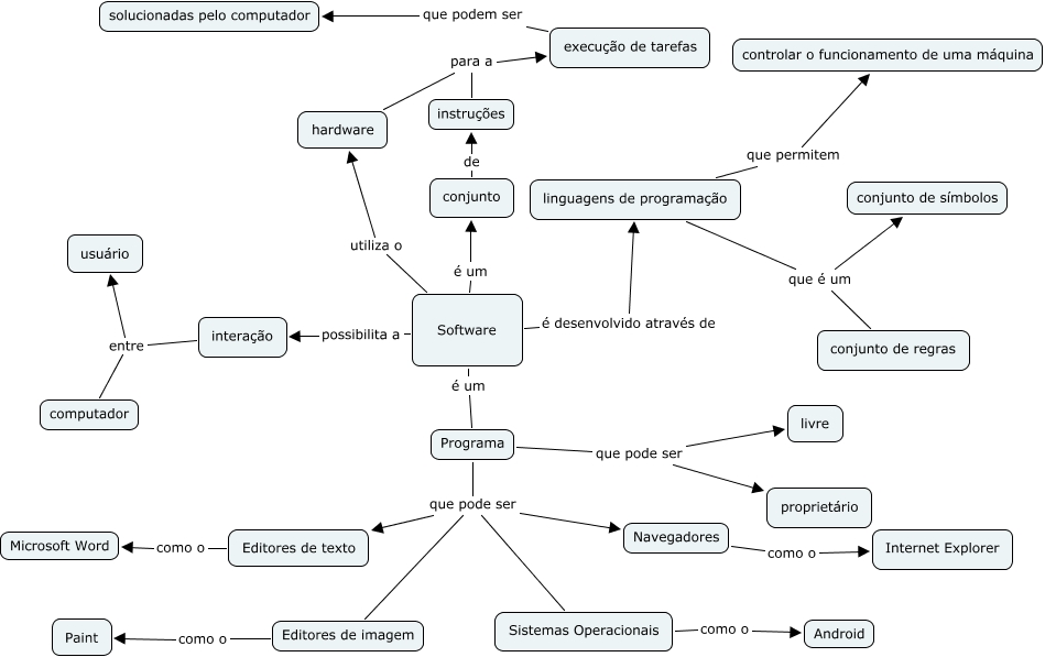 Esse mapa conceitual, produzido no IHMC CmapTools, tem a informação relacionada a: Software, conjunto de instruções, Editores de texto como o Microsoft Word, interação entre usuário, Programa que pode ser Editores de texto, Programa que pode ser proprietário, Navegadores como o Internet Explorer, Programa que pode ser Navegadores, linguagens de programação que é um conjunto de símbolos, Sistemas Operacionais como o Android, Programa que pode ser Editores de imagem, instruções para a execução de tarefas, Editores de imagem como o Paint, Programa que pode ser Sistemas Operacionais, Software possibilita a interação, Software utiliza o hardware, Software é desenvolvido através de linguagens de programação, linguagens de programação que é um conjunto de regras, Programa que pode ser livre, Software é um Programa, linguagens de programação que permitem controlar o funcionamento de uma máquina