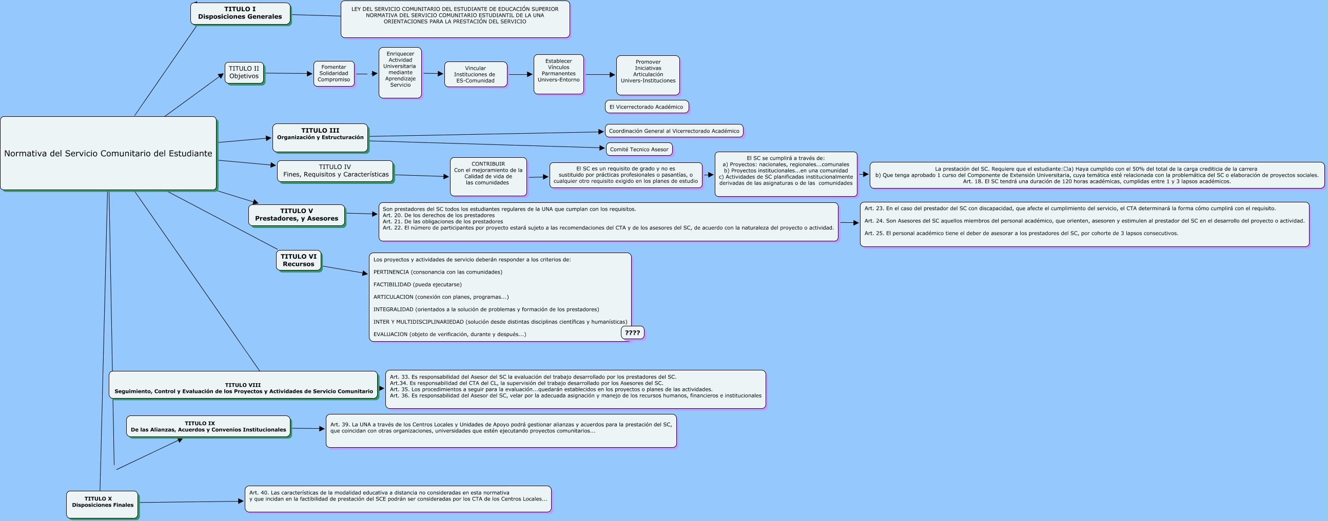 Este Cmap, tiene información relacionada con: NORMATIVA DEL SERVICIO COMUNITARIO DEL ESTUDIANTE UNA, TITULO VI Recursos ???? Los proyectos y actividades de servicio deberán responder a los criterios de: PERTINENCIA (consonancia con las comunidades) FACTIBILIDAD (pueda ejecutarse) ARTICULACION (conexión con planes, programas...) INTEGRALIDAD (orientados a la solución de problemas y formación de los prestadores) INTER Y MULTIDISCIPLINARIEDAD (solución desde distintas disciplinas científicas y humanísticas) EVALUACION (objeto de verificación, durante y después...), TITULO I Disposiciones Generales ???? LEY DEL SERVICIO COMUNITARIO DEL ESTUDIANTE DE EDUCACIÓN SUPERIOR NORMATIVA DEL SERVICIO COMUNITARIO ESTUDIANTIL DE LA UNA ORIENTACIONES PARA LA PRESTACIÓN DEL SERVICIO, Normativa del Servicio Comunitario del Estudiante ???? TITULO V Prestadores, y Asesores, Normativa del Servicio Comunitario del Estudiante ???? TITULO I Disposiciones Generales, TITULO V Prestadores, y Asesores ???? Son prestadores del SC todos los estudiantes regulares de la UNA que cumplan con los requisitos. Art. 20. De los derechos de los prestadores Art. 21. De las obligaciones de los prestadores Art. 22. El número de participantes por proyecto estará sujeto a las recomendaciones del CTA y de los asesores del SC, de acuerdo con la naturaleza del proyecto o actividad., TITULO III Organización y Estructuración ???? Comité Tecnico Asesor, Normativa del Servicio Comunitario del Estudiante ???? TITULO VIII Seguimiento, Control y Evaluación de los Proyectos y Actividades de Servicio Comunitario, Vincular Instituciones de ES-Comunidad ???? Establecer Vínculos Parmanentes Univers-Entorno, El SC se cumplirá a través de: a) Proyectos: nacionales, regionales...comunales b) Proyectos institucionales...en una comunidad c) Actividades de SC planificadas institucionalmente derivadas de las asignaturas o de las comunidades ???? La prestación del SC. Requiere que el estudiante: a) Haya cumplido con el 50% del total de la carga crediticia de la carrera b) Que tenga aprobado 1 curso del Componente de Extensión Universitaria, cuya temática esté relacionada con la problemática del SC o elaboración de proyectos sociales. Art. 18. El SC tendrá una duración de 120 horas académicas, cumplidas entre 1 y 3 lapsos académicos., Normativa del Servicio Comunitario del Estudiante ???? TITULO IV Fines, Requisitos y Características, CONTRIBUIR Con el mejoramiento de la Calidad de vida de las comunidades ???? El SC es un requisito de grado y no es sustituido por prácticas profesionales o pasantías, o cualquier otro requisito exigido en los planes de estudio, Normativa del Servicio Comunitario del Estudiante ???? TITULO VI Recursos, TITULO II Objetivos ???? Fomentar Solidaridad Compromiso, Normativa del Servicio Comunitario del Estudiante ???? TITULO X Disposiciones Finales, El SC es un requisito de grado y no es sustituido por prácticas profesionales o pasantías, o cualquier otro requisito exigido en los planes de estudio ???? El SC se cumplirá a través de: a) Proyectos: nacionales, regionales...comunales b) Proyectos institucionales...en una comunidad c) Actividades de SC planificadas institucionalmente derivadas de las asignaturas o de las comunidades, Normativa del Servicio Comunitario del Estudiante TITULO IX De las Alianzas, Acuerdos y Convenios Institucionales, Establecer Vínculos Parmanentes Univers-Entorno ???? Promover Iniciativas Articulación Univers-Instituciones, Son prestadores del SC todos los estudiantes regulares de la UNA que cumplan con los requisitos. Art. 20. De los derechos de los prestadores Art. 21. De las obligaciones de los prestadores Art. 22. El número de participantes por proyecto estará sujeto a las recomendaciones del CTA y de los asesores del SC, de acuerdo con la naturaleza del proyecto o actividad. ???? Art. 23. En el caso del prestador del SC con discapacidad, que afecte el cumplimiento del servicio, el CTA determinará la forma cómo cumplirá con el requisito. Art. 24. Son Asesores del SC aquellos miembros del personal académico, que orienten, asesoren y estimulen al prestador del SC en el desarrollo del proyecto o actividad. Art. 25. El personal académico tiene el deber de asesorar a los prestadores del SC, por cohorte de 3 lapsos consecutivos., Fomentar Solidaridad Compromiso Enriquecer Actividad Universitaria mediante Aprendizaje Servicio, TITULO X Disposiciones Finales ???? Art. 40. Las características de la modalidad educativa a distancia no consideradas en esta normativa y que incidan en la factibilidad de prestación del SCE podrán ser consideradas por los CTA de los Centros Locales...