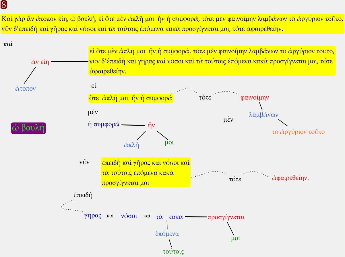 Este Cmap, tiene información relacionada con: frag.8, ἄν εἴη ???? εἰ ὅτε μὲν ἁπλῆ μοι ἦν ἡ συμφορά, τότε μὲν φαινοίμην λαμβάνων τὸ ἀργύριον τοῦτο, νῦν δ’ἐπειδὴ καὶ γῆρας καὶ νόσοι καὶ τὰ τούτοις ἑπόμενα κακὰ προσγίγνεται μοι, τότε ἀφαιρεθείην., μοι ???? προσγίγνεται, ἦν ???? μοι, λαμβάνων ???? φαινοίμην, ἄν εἴη ???? ἄτοπον, τότε ???? φαινοίμην, τότε ???? ἀφαιρεθείην., τὸ ἀργύριον τοῦτο ???? λαμβάνων, τότε ???? ἐπειδὴ καὶ γῆρας καὶ νόσοι καὶ τὰ τούτοις ἑπόμενα κακὰ προσγίγνεται μοι, ἑπόμενα ???? τὰ κακὰ, τότε ???? ὅτε ἁπλῆ μοι ἦν ἡ συμφορά, ἦν ???? ἁπλῆ, τούτοις ???? ἑπόμενα, ἐπειδὴ ???? γῆρας, ἡ συμφορά ???? ἦν, τὰ κακὰ ???? προσγίγνεται