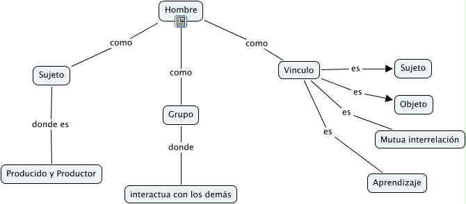 Este Cmap, tiene información relacionada con: Hombre, ser social, Hombre como Vinculo, Grupo donde interactua con los demás, Vinculo es Sujeto, Vinculo es Aprendizaje, Sujeto donde es Producido y Productor, Hombre como Sujeto, Hombre como Grupo, Vinculo es Objeto, Vinculo es Mutua interrelación