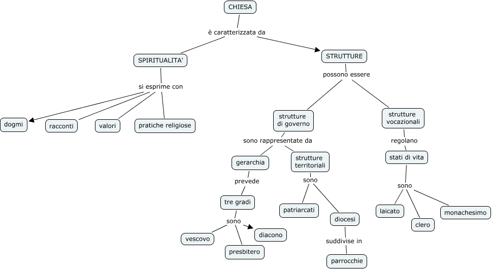 Questa Mappa Concettuale ha informazioni correlate a: La chiesa - strutture e spiritualità -, STRUTTURE possono essere strutture vocazionali, CHIESA è caratterizzata da SPIRITUALITA', SPIRITUALITA' si esprime con racconti, tre gradi sono diacono, strutture di governo sono rappresentate da strutture territoriali, SPIRITUALITA' si esprime con dogmi, gerarchia prevede tre gradi, CHIESA è caratterizzata da STRUTTURE, tre gradi sono vescovo, SPIRITUALITA' si esprime con pratiche religiose, tre gradi sono presbitero, STRUTTURE possono essere strutture di governo, strutture territoriali sono patriarcati, stati di vita sono clero, diocesi suddivise in parrocchie, SPIRITUALITA' si esprime con valori, stati di vita sono monachesimo, strutture vocazionali regolano stati di vita, strutture di governo sono rappresentate da gerarchia, stati di vita sono laicato