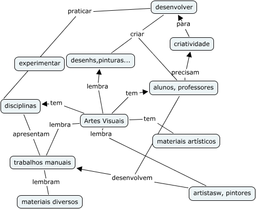 Esse mapa conceitual, produzido no IHMC CmapTools, tem a informação relacionada a: Mapa Conceitual Ana Luiza, Artes Visuais tem alunos, professores, disciplinas apresentam trabalhos manuais, Artes Visuais lembra desenhs,pinturas..., alunos, professores precisam criatividade, Artes Visuais tem materiais artísticos, desenvolver criar desenhs,pinturas..., desenvolver praticar disciplinas, Artes Visuais tem disciplinas, Artes Visuais lembra trabalhos manuais, Artes Visuais lembra artistasw, pintores, trabalhos manuais lembram materiais diversos, alunos, professores criar desenhs,pinturas..., criatividade para desenvolver, artistasw, pintores desenvolvem trabalhos manuais, alunos, professores desenvolvem trabalhos manuais
