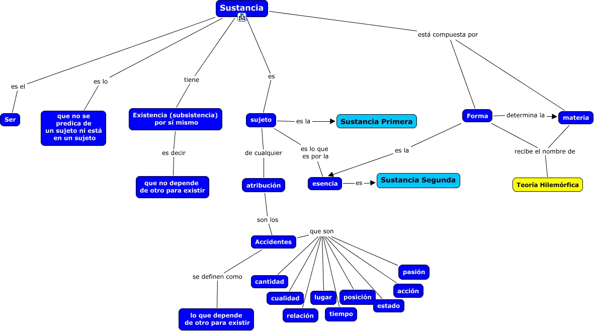 Este Cmap, tiene información relacionada con: Aristóteles_Sustancia, Sustancia está compuesta por Forma, esencia es Sustancia Segunda, Forma recibe el nombre de Teoría Hilemórfica, Sustancia es el Ser, Accidentes que son lugar, Accidentes que son cualidad, Sustancia está compuesta por materia, sujeto es la Sustancia Primera, Forma es la esencia, Accidentes que son tiempo, Sustancia es sujeto, Existencia (subsistencia) por sí mismo es decir que no depende de otro para existir, Accidentes que son estado, Sustancia tiene Existencia (subsistencia) por sí mismo, materia recibe el nombre de Teoría Hilemórfica, sujeto es lo que es por la esencia, Accidentes que son acción, Accidentes que son pasión, sujeto de cualquier atribución, Accidentes que son relación
