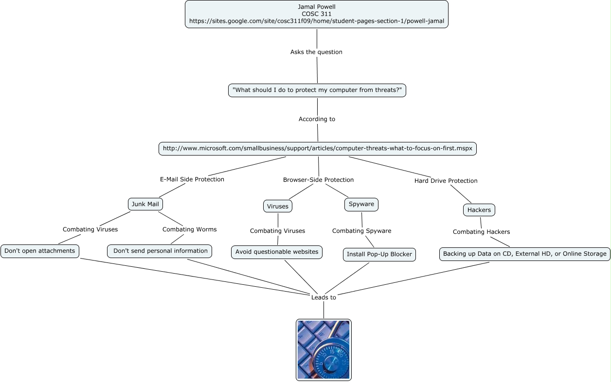 This Concept Map, created with IHMC CmapTools, has information related to: Jamal Powell - Computer Threats, Backing up Data on CD, External HD, or Online Storage Leads to, Don't send personal information Leads to, Junk Mail Combating Viruses Don't open attachments, Spyware Combating Spyware Install Pop-Up Blocker, Install Pop-Up Blocker Leads to, Viruses Combating Viruses Avoid questionable websites, "What should I do to protect my computer from threats?" According to http://www.microsoft.com/smallbusiness/support/articles/computer-threats-what-to-focus-on-first.mspx, http://www.microsoft.com/smallbusiness/support/articles/computer-threats-what-to-focus-on-first.mspx E-Mail Side Protection Junk Mail, Jamal Powell COSC 311 https://sites.google.com/site/cosc311f09/home/student-pages-section-1/powell-jamal Asks the question "What should I do to protect my computer from threats?", Don't open attachments Leads to, Junk Mail Combating Worms Don't send personal information, http://www.microsoft.com/smallbusiness/support/articles/computer-threats-what-to-focus-on-first.mspx Browser-Side Protection Viruses, Hackers Combating Hackers Backing up Data on CD, External HD, or Online Storage, http://www.microsoft.com/smallbusiness/support/articles/computer-threats-what-to-focus-on-first.mspx Hard Drive Protection Hackers, Avoid questionable websites Leads to, http://www.microsoft.com/smallbusiness/support/articles/computer-threats-what-to-focus-on-first.mspx Browser-Side Protection Spyware