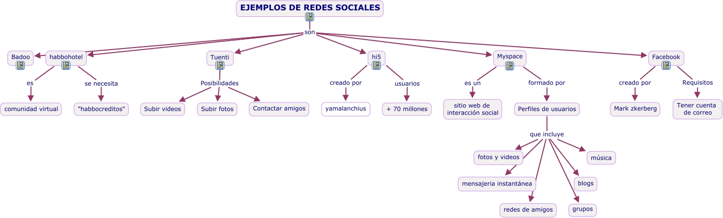 Este Cmap, tiene información relacionada con: ejemplos de redes sociales m i x, hi5 creado por yamalanchius, Perfiles de usuarios que incluye fotos y videos, hi5 usuarios + 70 millones, habbohotel es comunidad virtual, Perfiles de usuarios que incluye blogs, Tuenti Posibilidades Contactar amigos, EJEMPLOS DE REDES SOCIALES son Badoo, Perfiles de usuarios que incluye música, Perfiles de usuarios que incluye grupos, EJEMPLOS DE REDES SOCIALES son hi5, EJEMPLOS DE REDES SOCIALES son Myspace, habbohotel se necesita "habbocreditos", Perfiles de usuarios que incluye mensajeria instantánea, Perfiles de usuarios que incluye redes de amigos, Facebook creado por Mark zkerberg, EJEMPLOS DE REDES SOCIALES son Facebook, EJEMPLOS DE REDES SOCIALES son Tuenti, Tuenti Posibilidades Subir fotos, Myspace es un sitio web de interacción social, Tuenti Posibilidades Subir videos
