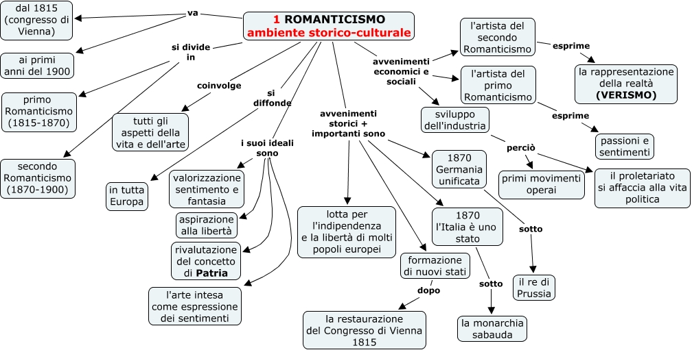 Questa Cmap, creata con IHMC CmapTools, contiene informazioni relative a: 1 ROMANTICISMO AMBIENTE STORICO CULTURALE, l'artista del primo Romanticismo esprime passioni e sentimenti, 1 ROMANTICISMO ambiente storico-culturale va dal 1815 (congresso di Vienna), 1 ROMANTICISMO ambiente storico-culturale si divide in secondo Romanticismo (1870-1900), formazione di nuovi stati dopo la restaurazione del Congresso di Vienna 1815, 1 ROMANTICISMO ambiente storico-culturale avvenimenti economici e sociali l'artista del primo Romanticismo, 1 ROMANTICISMO ambiente storico-culturale avvenimenti storici + importanti sono 1870 Germania unificata, sviluppo dell'industria perciò primi movimenti operai, l'artista del secondo Romanticismo esprime la rappresentazione della realtà (VERISMO), sviluppo dell'industria perciò il proletariato si affaccia alla vita politica, 1 ROMANTICISMO ambiente storico-culturale i suoi ideali sono rivalutazione del concetto di Patria, 1 ROMANTICISMO ambiente storico-culturale avvenimenti storici + importanti sono formazione di nuovi stati, 1 ROMANTICISMO ambiente storico-culturale i suoi ideali sono valorizzazione sentimento e fantasia, 1 ROMANTICISMO ambiente storico-culturale avvenimenti economici e sociali sviluppo dell'industria, 1870 l'Italia è uno stato sotto la monarchia sabauda, 1 ROMANTICISMO ambiente storico-culturale avvenimenti storici + importanti sono 1870 l'Italia è uno stato, 1 ROMANTICISMO ambiente storico-culturale i suoi ideali sono l'arte intesa come espressione dei sentimenti, 1 ROMANTICISMO ambiente storico-culturale avvenimenti economici e sociali l'artista del secondo Romanticismo, 1 ROMANTICISMO ambiente storico-culturale va ai primi anni del 1900, 1 ROMANTICISMO ambiente storico-culturale si diffonde in tutta Europa, 1 ROMANTICISMO ambiente storico-culturale i suoi ideali sono aspirazione alla libertà