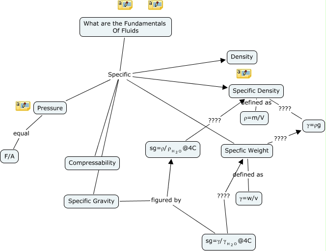 This Concept Map, created with IHMC CmapTools, has information related to: Cmap1, What are the Fundamentals Of Fluids Specific Specific Gravity, Pressure equal F/A, What are the Fundamentals Of Fluids Specific Density, What are the Fundamentals Of Fluids Specific Specific Density, <math xmlns="http://www.w3.org/1998/Math/MathML"> <mrow> <mtext> sg=ρ/ </mtext> <mmultiscripts> <mtext> ρ </mtext> <mrow> <mmultiscripts> <mtext> H </mtext> <mtext> 2 </mtext> <none/> </mmultiscripts> <mtext> O </mtext> </mrow> <none/> </mmultiscripts> <mtext> @4C </mtext> </mrow> </math> ???? Specific Density, <math xmlns="http://www.w3.org/1998/Math/MathML"> <mrow> <mtext> sg=γ/ </mtext> <mmultiscripts> <mtext> γ </mtext> <mrow> <mmultiscripts> <mtext> H </mtext> <mtext> 2 </mtext> <none/> </mmultiscripts> <mtext> O </mtext> </mrow> <none/> </mmultiscripts> <mtext> @4C </mtext> </mrow> </math> ???? Specfic Weight, Specific Density ???? γ=ρg, What are the Fundamentals Of Fluids Specific Compressability, What are the Fundamentals Of Fluids Specific Specfic Weight, Specific Gravity figured by <math xmlns="http://www.w3.org/1998/Math/MathML"> <mrow> <mtext> sg=γ/ </mtext> <mmultiscripts> <mtext> γ </mtext> <mrow> <mmultiscripts> <mtext> H </mtext> <mtext> 2 </mtext> <none/> </mmultiscripts> <mtext> O </mtext> </mrow> <none/> </mmultiscripts> <mtext> @4C </mtext> </mrow> </math>, Specfic Weight ???? γ=ρg, Specific Gravity figured by <math xmlns="http://www.w3.org/1998/Math/MathML"> <mrow> <mtext> sg=ρ/ </mtext> <mmultiscripts> <mtext> ρ </mtext> <mrow> <mmultiscripts> <mtext> H </mtext> <mtext> 2 </mtext> <none/> </mmultiscripts> <mtext> O </mtext> </mrow> <none/> </mmultiscripts> <mtext> @4C </mtext> </mrow> </math>, Specific Density defined as ρ=m/V, Specfic Weight defined as γ=w/v, What are the Fundamentals Of Fluids Specific Pressure