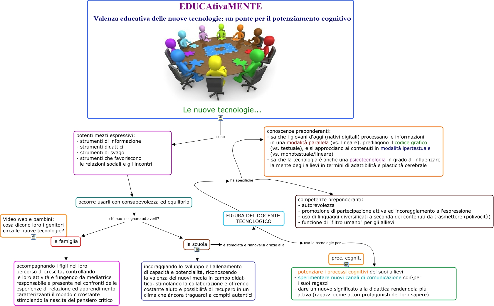 Questa Cmap, creata con IHMC CmapTools, contiene informazioni relative a: Mappa tecnologie per l'appr, la famiglia ???? accompagnando i figli nel loro percorso di crescita, controllando le loro attività e fungendo da mediatrice responsabile e presente nei confronti delle esperienze di relazione ed apprendimento caratterizzanti il mondo circostante stimolando la nascita del pensiero critico, FIGURA DEL DOCENTE TECNOLOGICO usa le tecnologie per - potenziare i processi cognitivi dei suoi allievi - sperimentare nuovi canali di comunicazione con\per i suoi ragazzi - dare un nuovo significato alla didattica rendendola più attiva (ragazzi come attori protagonisti del loro sapere), occorre usarli con consapevolezza ed equilibrio chi può insegnare ad averli? la famiglia, FIGURA DEL DOCENTE TECNOLOGICO ha specifiche conoscenze preponderanti: - sa che i giovani d'oggi (nativi digitali) processano le informazioni in una modalità parallela (vs. lineare), prediligono il codice grafico (vs. testuale), e si approcciano ai contenuti in modalità ipertestuale (vs. monotestuale/lineare) - sa che la tecnologia è anche una psicotecnologia in grado di influenzare la mente degli allievi in termini di adattibilità e plasticità cerebrale vs. lineare), la scuola è stimolata e rinnovarsi grazie alla FIGURA DEL DOCENTE TECNOLOGICO, la scuola ???? incoraggiando lo sviluppo e l'allenamento di capacità e potenzialità, riconoscendo la valenza dei nuovi media in campo didat- tico, stimolando la collaborazione e offrendo costante aiuto e possibilità di recupero in un clima che àncora traguardi a compiti autentici, occorre usarli con consapevolezza ed equilibrio chi può insegnare ad averli? la scuola, EDUCAtivaMENTE Valenza educativa delle nuove tecnologie: un ponte per il potenziamento cognitivo Le nuove tecnologie... sono potenti mezzi espressivi: - strumenti di informazione - strumenti didattici - strumenti di svago - strumenti che favoriscono le relazioni sociali e gli incontri, FIGURA DEL DOCENTE TECNOLOGICO ha specifiche competenze preponderanti: - autorevolezza - promozione di partecipazione attiva ed incoraggiamento all'espressione - uso di linguaggi diversificati a seconda dei contenuti da trasmettere (polivocità) - funzione di "filtro umano" per gli allievi, potenti mezzi espressivi: - strumenti di informazione - strumenti didattici - strumenti di svago - strumenti che favoriscono le relazioni sociali e gli incontri ???? occorre usarli con consapevolezza ed equilibrio