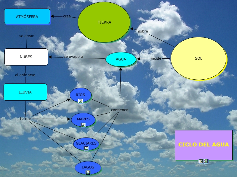 Este Cmap, tiene información relacionada con: Ciclo del agua, LLUVIA forma RÍOS, LAGOS contienen AGUA, MARES contienen AGUA, LLUVIA forma LAGOS, AGUA se evapora NUBES, ATMÓSFERA se crean NUBES, GLACIARES contienen AGUA, LLUVIA forma MARES, SOL sobre TIERRA, TIERRA crea ATMÓSFERA, SOL incide AGUA, RÍOS contienen AGUA, LLUVIA forma GLACIARES, NUBES al enfriarse LLUVIA