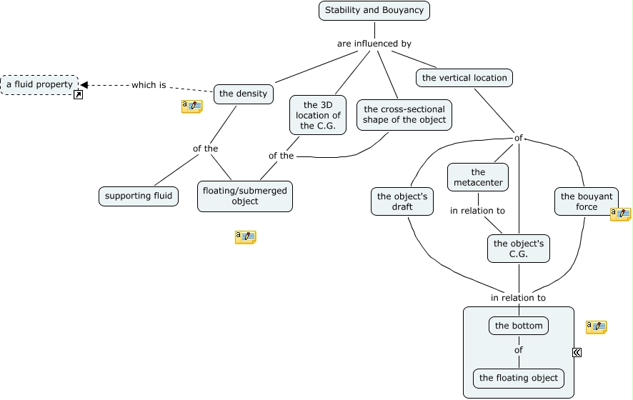 This Concept Map, created with IHMC CmapTools, has information related to: StabilityBouyancy, the vertical location of the metacenter, the object's draft in relation to the bottom, the vertical location of the object's C.G., Stability and Bouyancy are influenced by the cross-sectional shape of the object, the bouyant force in relation to the bottom, the density which is a fluid property, the vertical location of the object's draft, the metacenter in relation to the object's C.G., the bottom of the floating object, the density of the floating/submerged object, the vertical location of the bouyant force, Stability and Bouyancy are influenced by the 3D location of the C.G., the cross-sectional shape of the object of the floating/submerged object, Stability and Bouyancy are influenced by the density, the 3D location of the C.G. of the floating/submerged object, Stability and Bouyancy are influenced by the vertical location, the density of the supporting fluid, the object's C.G. in relation to the bottom