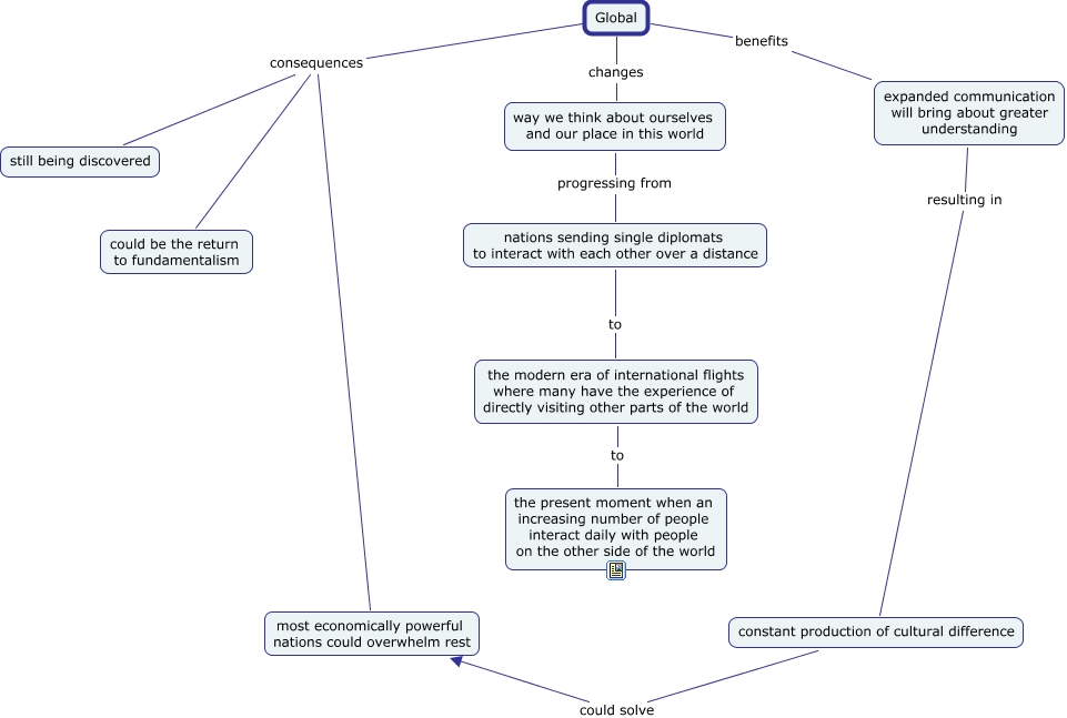 This Concept Map, created with IHMC CmapTools, has information related to: Global, Global changes way we think about ourselves and our place in this world, the modern era of international flights where many have the experience of directly visiting other parts of the world to the present moment when an increasing number of people interact daily with people on the other side of the world, Global consequences still being discovered, Global consequences could be the return to fundamentalism, way we think about ourselves and our place in this world progressing from nations sending single diplomats to interact with each other over a distance, constant production of cultural difference could solve most economically powerful nations could overwhelm rest, nations sending single diplomats to interact with each other over a distance to the modern era of international flights where many have the experience of directly visiting other parts of the world, expanded communication will bring about greater understanding resulting in constant production of cultural difference, Global consequences most economically powerful nations could overwhelm rest