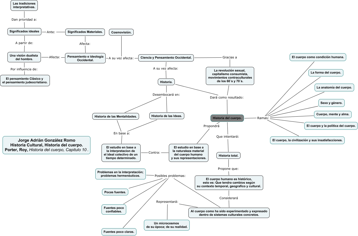 Este Cmap, tiene información relacionada con: Historia del cuerpo, Historia del cuerpo. Ramas: Sexo y género., Historia de las Ideas. En base a: El estudio en base a la interpretacion de el ideal colectivo de un tiempo determinado., Significados ideales A partir de: Una visión dualista del hombre., Historia de las Mentalidades. En base a: El estudio en base a la interpretacion de el ideal colectivo de un tiempo determinado., Historia del cuerpo. Ramas: El cuerpo como condición humana., Pensamiento e ideología Occidental. A su vez afecta: Ciencia y Pensamiento Occidental., Al cuerpo como ha sido experimentado y expresado dentro de sistemas culturales concretos. Representará: Un microcosmos de su época; de su realidad., Una visión dualista del hombre. Afecta: Pensamiento e ideología Occidental., Al cuerpo como ha sido experimentado y expresado dentro de sistemas culturales concretos. Posibles problemas: Pocas fuentes., Historia. Desembocará en: Historia de las Ideas., Historia total. Propone que: El cuerpo humano es histórico, esto es: Que tendra cambios según su contexto temporal, geografico y cultural., Historia del cuerpo. Ramas: La anatomía del cuerpo., El estudio en base a la naturaleza material del cuerpo humano y sus representaciones. Contra: El estudio en base a la interpretacion de el ideal colectivo de un tiempo determinado., Una visión dualista del hombre. Por influencia de: El pensamiento Clásico y el pensamiento judeocristiano., Historia del cuerpo. Dará como resultado: La revolución sexual, capitalismo consumista, movimientos contraculturales de los 60´s y 70´s., Las tradiciones interpretativas. Dan prioridad a: Significados ideales, Pensamiento e ideología Occidental. A su vez afecta: Cosmovisión., Ciencia y Pensamiento Occidental. Gracias a La revolución sexual, capitalismo consumista, movimientos contraculturales de los 60´s y 70´s., Historia. Desembocará en: Historia de las Mentalidades., Historia del cuerpo. Ramas: Cuerpo, mente y alma.