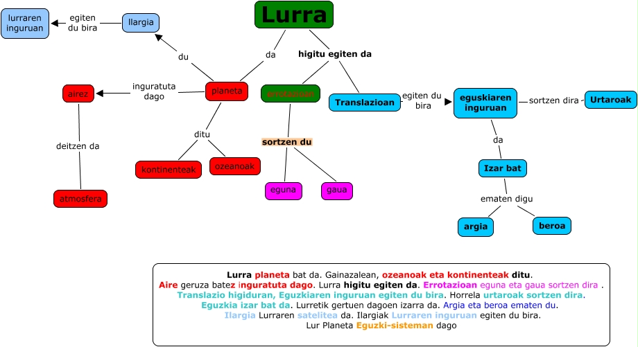 IHMC CmapTools-ekin sortu den kontzeptu-mapa honek honi buruzko informazioa du: alex artur, Izar bat ematen digu beroa, planeta inguratuta dago airez, errotazioan sortzen du gaua, planeta ditu ozeanoak, airez deitzen da atmosfera, planeta ditu kontinenteak, Lurra higitu egiten da Translazioan, Lurra da planeta, llargia egiten du bira lurraren inguruan, errotazioan sortzen du eguna, eguskiaren inguruan da Izar bat, Translazioan egiten du bira eguskiaren inguruan, eguskiaren inguruan sortzen dira Urtaroak, Izar bat ematen digu argia, planeta du llargia, Lurra higitu egiten da errotazioan