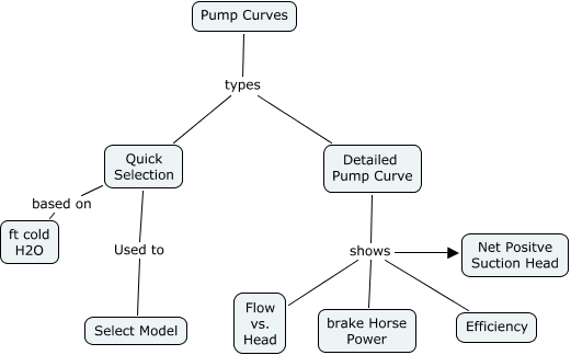 This Concept Map, created with IHMC CmapTools, has information related to: Pumps, Quick Selection based on ft cold H2O, Detailed Pump Curve shows brake Horse Power, Pump Curves types Detailed Pump Curve, Quick Selection Used to Select Model, Detailed Pump Curve shows Efficiency, Detailed Pump Curve shows Flow vs. Head, Detailed Pump Curve shows Net Positve Suction Head, Pump Curves types Quick Selection