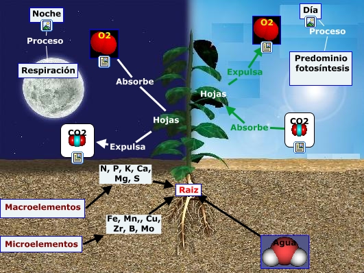 Este Cmap, tiene información relacionada con: Fotosíntesis, Hojas Expulsa CO2, Hojas Expulsa O2, Microelementos Fe, Mn,, Cu, Zr, B, Mo Raiz, Macroelementos N, P, K, Ca, Mg, S Raiz, Día Proceso Predominio fotosíntesis, CO2 Absorbe Hojas, Agua ???? Raiz, O2 Absorbe Hojas