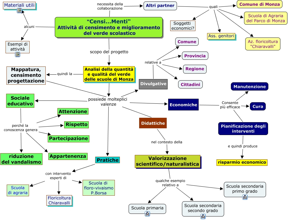 Questa Cmap, creata con IHMC CmapTools, contiene informazioni relative a: Censimento verde scolastico, Pratiche con intervento esperti di Floricoltura Chiaravalli, "Censi...Menti" Attività di censimento e miglioramento del verde scolastico alcuni Materiali utili, Altri partner quali Scuola di Agraria del Parco di Monza, Analisi della quantità e qualità del verde delle scuole di Monza possiede molteplici valenze Didattiche, Divulgative relative a Regione, Mappatura, censimento progettazione possiede molteplici valenze Pratiche, Pratiche con intervento esperti di Scuola di floro-vivaismo P.Borsa, Valorizzazione scientifico/naturalistica qualche esempio relativo a Scuola secondaria primo grado, Economiche Consente più efficace Manutenzione, Valorizzazione scientifico/naturalistica qualche esempio relativo a Scuola primaria, Pianificazione degli interventi e quindi produce risparmio economico, Mappatura, censimento progettazione possiede molteplici valenze Sociale educativo, Analisi della quantità e qualità del verde delle scuole di Monza possiede molteplici valenze Pratiche, Analisi della quantità e qualità del verde delle scuole di Monza possiede molteplici valenze Sociale educativo, Altri partner quali Ass. genitori, Sociale educativo perché la conoscenza genera Partecipazione, Sociale educativo perché la conoscenza genera Attenzione, Sociale educativo perché la conoscenza genera Appartenenza, Economiche Consente più efficace Pianificazione degli interventi, Sociale educativo perché la conoscenza genera Rispetto