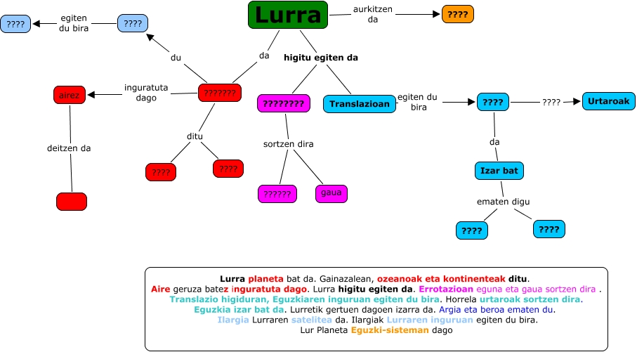 IHMC CmapTools-ekin sortu den kontzeptu-mapa honek honi buruzko informazioa du: Lur Planeta_belen, Lurra higitu egiten da ????????, Izar bat ematen digu ????, Lurra aurkitzen da ????, ??????? inguratuta dago airez, ??????? ditu ????, ???????? sortzen dira ??????, Lurra higitu egiten da Translazioan, ??????? ditu ????, airez deitzen da ????, Lurra da ???????, ???? egiten du bira ????, Translazioan egiten du bira ????, ???? da Izar bat, Izar bat ematen digu ????, ???? ???? Urtaroak, ???????? sortzen dira gaua, ??????? du ????