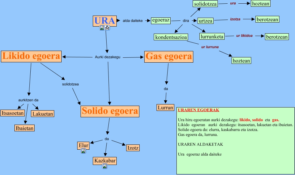 IHMC CmapTools-ekin sortu den kontzeptu-mapa honek honi buruzko informazioa du: ura_asier_isaias, egoeraz dira solidotzea, URA Aurki dezakegu Gas egoera, Solido egoera da Kazkabar, URA alda daiteke egoeraz, Likido egoera solidotzea Solido egoera, lurrunketa ur likidoa berotzean, Solido egoera da Elur, Solido egoera da Izotz, Likido egoera aurkitzen da Ibaietan, Likido egoera aurkitzen da Lakuetan, solidotzea ura hoztean, Likido egoera aurkitzen da Itsasoetan, egoeraz dira lurrunketa, egoeraz dira urtzea, egoeraz dira kondentsazioa, urtzea izotza berotzean, URA Aurki dezakegu Likido egoera, URA Aurki dezakegu Solido egoera, kondentsazioa ur lurruna hoztean, Gas egoera da Lurrun