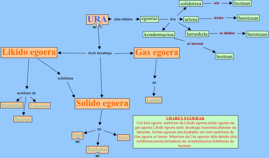 IHMC CmapTools-ekin sortu den kontzeptu-mapa honek honi buruzko informazioa du: ura_paula_yeray, egoeraz dira solidotzea, URA Aurki dezakegu Gas egoera, Solido egoera da Kazkabar, URA alda daiteke egoeraz, Likido egoera solidotzea Solido egoera, lurrunketa ur likidoa berotzean, Solido egoera da Elur, Solido egoera da Izotz, Likido egoera aurkitzen da Ibaietan, Likido egoera aurkitzen da Lakuetan, solidotzea ura hoztean, Likido egoera aurkitzen da Itsasoetan, egoeraz dira lurrunketa, egoeraz dira urtzea, egoeraz dira kondentsazioa, urtzea izotza berotzean, URA Aurki dezakegu Likido egoera, URA Aurki dezakegu Solido egoera, kondentsazioa ur lurruna hoztean, Gas egoera da Lurrun