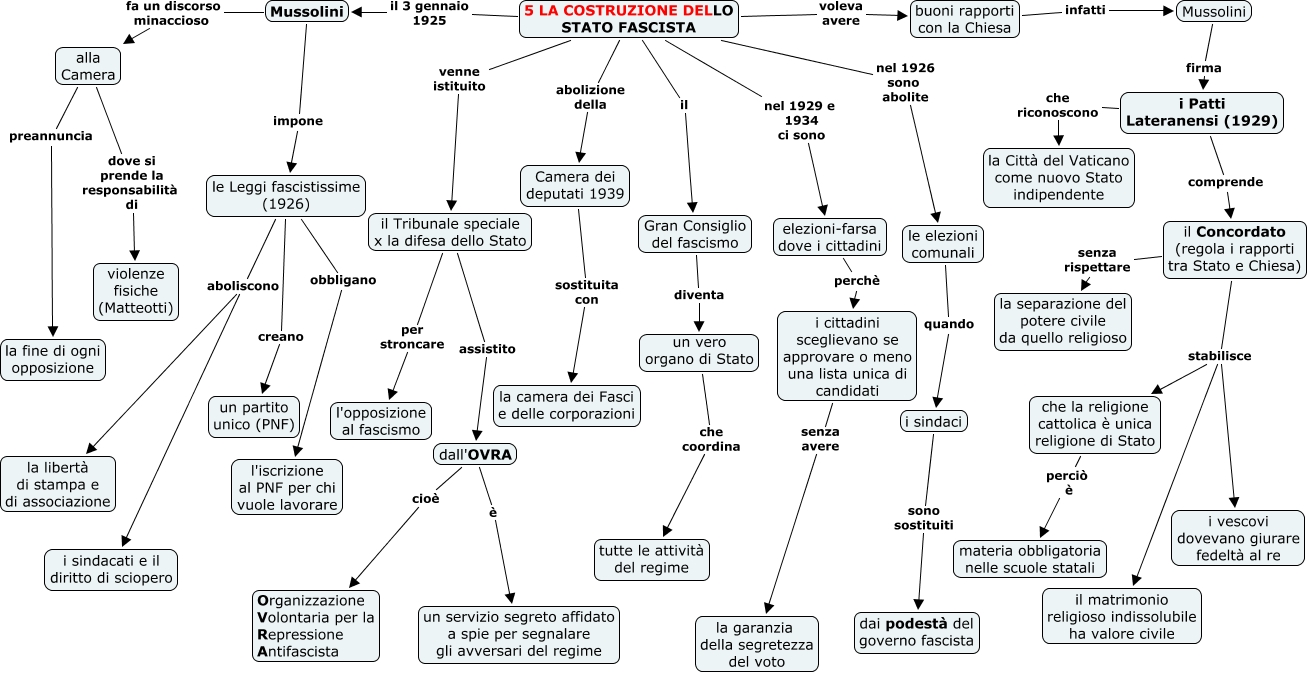 Questa Cmap, creata con IHMC CmapTools, contiene informazioni relative a: 5 LA COSTRUZIONE DLELO STATO FASCISTA, 5 LA COSTRUZIONE DELLO STATO FASCISTA nel 1926 sono abolite le elezioni comunali, i Patti Lateranensi (1929) che riconoscono la Città del Vaticano come nuovo Stato indipendente, Mussolini fa un discorso minaccioso alla Camera, il Concordato (regola i rapporti tra Stato e Chiesa) stabilisce i vescovi dovevano giurare fedeltà al re, Camera dei deputati 1939 sostituita con la camera dei Fasci e delle corporazioni, 5 LA COSTRUZIONE DELLO STATO FASCISTA abolizione della Camera dei deputati 1939, Gran Consiglio del fascismo diventa un vero organo di Stato, il Tribunale speciale x la difesa dello Stato per stroncare l'opposizione al fascismo, i cittadini sceglievano se approvare o meno una lista unica di candidati senza avere la garanzia della segretezza del voto, il Concordato (regola i rapporti tra Stato e Chiesa) stabilisce che la religione cattolica è unica religione di Stato, 5 LA COSTRUZIONE DELLO STATO FASCISTA nel 1929 e 1934 ci sono elezioni-farsa dove i cittadini, un vero organo di Stato che coordina tutte le attività del regime, le elezioni comunali quando i sindaci, il Tribunale speciale x la difesa dello Stato assistito dall'OVRA, dall'OVRA cioè Organizzazione Volontaria per la Repressione Antifascista, Mussolini impone le Leggi fascistissime (1926), le Leggi fascistissime (1926) creano un partito unico (PNF), buoni rapporti con la Chiesa infatti Mussolini, il Concordato (regola i rapporti tra Stato e Chiesa) senza rispettare la separazione del potere civile da quello religioso, 5 LA COSTRUZIONE DELLO STATO FASCISTA venne istituito il Tribunale speciale x la difesa dello Stato