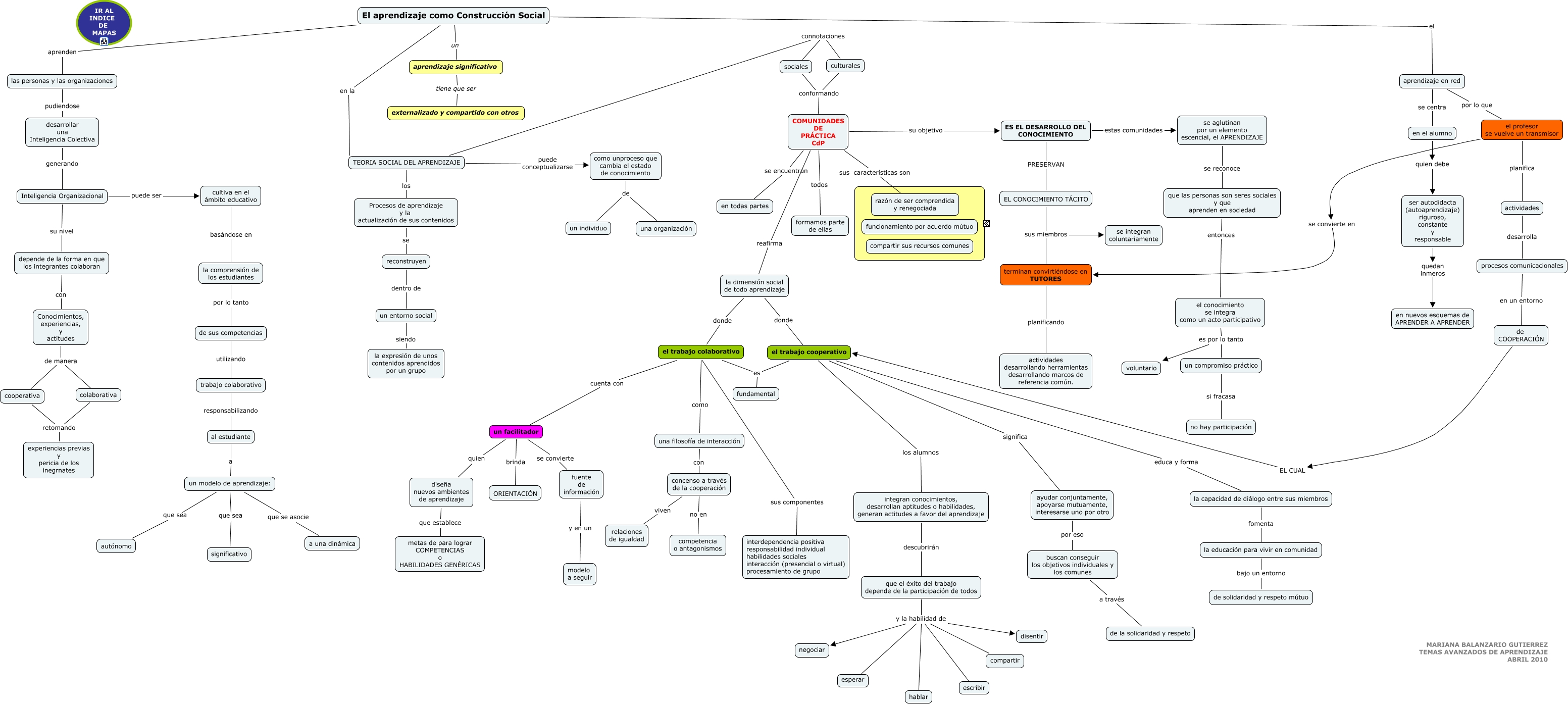 Este Cmap, tiene información relacionada con: 2 EL APRENDIZAJE COMO CONSTRUCCION SOCIAL, fuente de información y en un modelo a seguir, colaborativa retomando experiencias previas y pericia de los inegrnates, el trabajo cooperativo los alumnos integran conocimientos, desarrollan aptitudes o habilidades, generan actitudes a favor del aprendizaje, se aglutinan por un elemento escencial, el APRENDIZAJE se reconoce que las personas son seres sociales y que aprenden en sociedad, El aprendizaje como Construcción Social el aprendizaje en red, sociales conformando COMUNIDADES DE PRÁCTICA CdP, al estudiante a un modelo de aprendizaje:, de COOPERACIÓN EL CUAL el trabajo cooperativo, concenso a través de la cooperación no en competencia o antagonismos, la dimensión social de todo aprendizaje donde el trabajo cooperativo, reconstruyen dentro de un entorno social, un facilitador quien diseña nuevos ambientes de aprendizaje, aprendizaje significativo tiene que ser externalizado y compartido con otros, el trabajo cooperativo es fundamental, COMUNIDADES DE PRÁCTICA CdP reafirma la dimensión social de todo aprendizaje, un modelo de aprendizaje: que sea autónomo, el trabajo cooperativo educa y forma la capacidad de diálogo entre sus miembros, EL CONOCIMIENTO TÁCITO sus miembros se integran coluntariamente, el conocimiento se integra como un acto participativo es por lo tanto un compromiso práctico, que el éxito del trabajo depende de la participación de todos y la habilidad de esperar