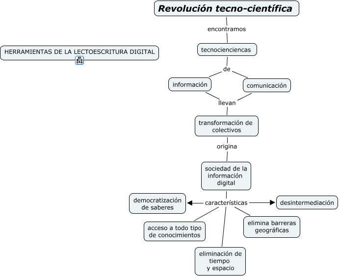 Este Cmap, tiene información relacionada con: revolución tecno-científica, transformación de colectivos origina sociedad de la información digital, comunicación llevan transformación de colectivos, tecnocienciencas de información, sociedad de la información digital características desintermediación, tecnocienciencas de comunicación, sociedad de la información digital características democratización de saberes, sociedad de la información digital características elimina barreras geográficas, sociedad de la información digital características acceso a todo tipo de conocimientos, Revolución tecno-científica encontramos tecnocienciencas, sociedad de la información digital características eliminación de tiempo y espacio, información llevan transformación de colectivos
