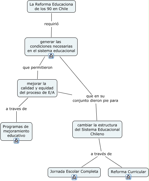 Este Cmap, tiene información relacionada con: Politicas Educacionales de los 90 en Chile, generar las condiciones necesarias en el sistema educacional que permitieron mejorar la calidad y equidad del proceso de E/A, mejorar la calidad y equidad del proceso de E/A a traves de Programas de mejoramiento educativo, generar las condiciones necesarias en el sistema educacional que en su conjunto dieron pie para cambiar la estructura del Sistema Educacional Chileno, mejorar la calidad y equidad del proceso de E/A que en su conjunto dieron pie para cambiar la estructura del Sistema Educacional Chileno, cambiar la estructura del Sistema Educacional Chileno a través de Reforma Curricular, cambiar la estructura del Sistema Educacional Chileno a través de Jornada Escolar Completa, La Reforma Educaciona de los 90 en Chile requirió generar las condiciones necesarias en el sistema educacional