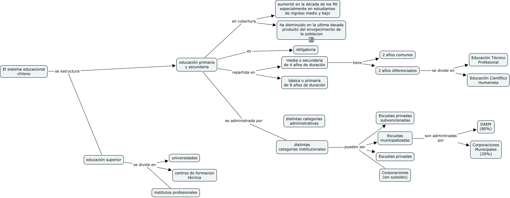 Este Cmap, tiene información relacionada con: Estructura Educacion Chilena, media o secundaria de 4 años de duración tiene 2 años comunes, Escuelas municipalizadas son adminitradas por Corporaciones Municipales (20%), El sistema educacional chileno se estructura educación primaria y secundaria, distintas categorias institucionales pueden ser Escuelas privadas, educación primaria y secundaria es obligatoria, distintas categorias institucionales pueden ser Escuelas municipalizadas, educación primaria y secundaria repartida en básica o primaria de 8 años de duración, educación primaria y secundaria en cobertura ha disminuido en la ultima decada producto del envejecimiento de la poblacion, educación primaria y secundaria repartida en media o secundaria de 4 años de duración, educación superior se divide en institutos profesionales, educación primaria y secundaria es administrada por distintas categorias institucionales, educación superior se divide en universidades, distintas categorias institucionales pueden ser Escuelas privadas subvencionadas, Escuelas municipalizadas son adminitradas por DAEM (80%), educación primaria y secundaria en cobertura aumentó en la década de los 90 especialmente en estudiantes de ingreso medio y bajo, 2 años diferenciados se divide en Educación Técnico Profesional, educación superior se divide en centros de formacion técnica, El sistema educacional chileno se estructura educación superior, distintas categorias institucionales pueden ser Corporaciones (sin subsidio), media o secundaria de 4 años de duración tiene 2 años diferenciados