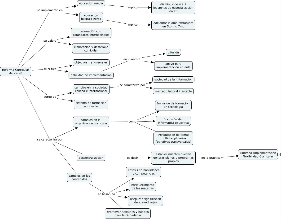 Este Cmap, tiene información relacionada con: Reforma Curricular Chilena, debilidad de implementación en cuanto a difusión, cambios en la sociedad chilena e internacional se caracteriza por sociedad de la informacion, educacion media implico disminuir de 4 a 2 los annos de especializacion en TP, Reforma Curricular de los 90 se valora alineación con estandares internacinales, cambios en la organizacion curricular como Inclusion de formacion en tecnologia, cambios en la organizacion curricular como introduccion de temas multidisciplinarios (objetivos transversales), Implementación limitada de flexibilidad curricular (14% con planes propios) debido a Falta formación docente, debilidad de implementación en cuanto a apoyo para implementación en aula, Reforma Curricular de los 90 se implemento en educacion media, Implementación limitada de flexibilidad curricular (14% con planes propios) debido a Falta iniciativa de MINEDUC para fomentar elaboración curricular propia, cambios en la sociedad chilena e internacional se caracteriza por mercado laboral inestable, Reforma Curricular de los 90 surge de sistema de formacion anticuado, cambios en los contenidos se basan en asegurar significacion de aprendizajes, Reforma Curricular de los 90 se caracteriza por descentralizacion, descentralizacion es decir establecimientos pueden generar planes y programas propios, Reforma Curricular de los 90 se valora elaboración y desarrollo curricular, cambios en los contenidos se basan en enriquecimiento de las materias, establecimientos pueden generar planes y programas propios en la practica Implementación limitada de flexibilidad curricular (14% con planes propios), Implementación limitada de flexibilidad curricular (14% con planes propios) debido a Falta instancias en establecimientos para diseño curricular, cambios en los contenidos se basan en enfasis en habilidades o competencias