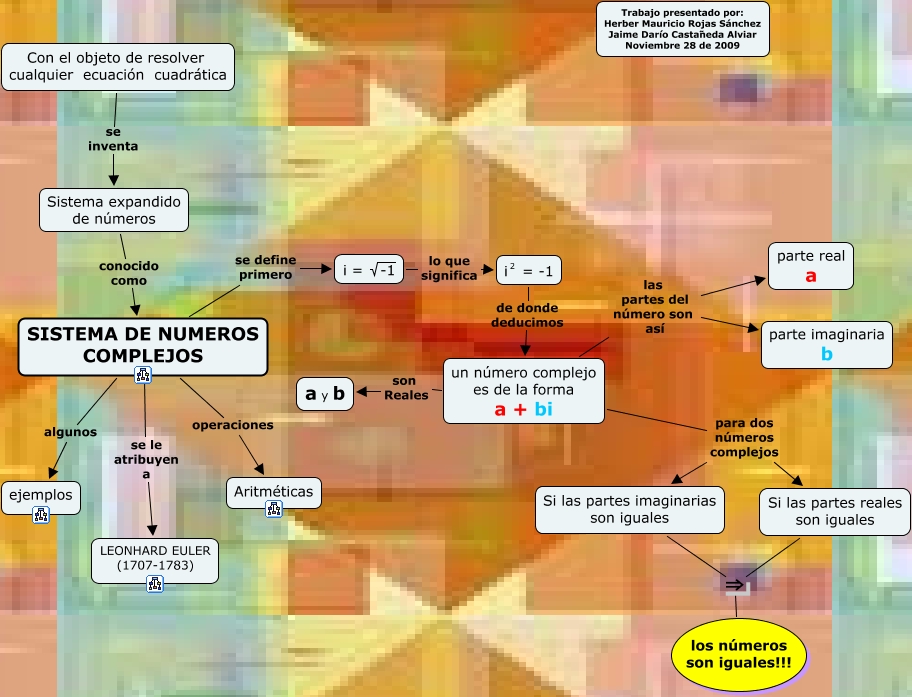 Este Cmap, tiene información relacionada con: ComplejosPpal, un número complejo es de la forma a + bi las partes del número son así parte imaginaria b, un número complejo es de la forma a + bi para dos números complejos Si las partes imaginarias son iguales, Con el objeto de resolver cualquier ecuación cuadrática se inventa Sistema expandido de números, SISTEMA DE NUMEROS COMPLEJOS se define primero <math xmlns="http://www.w3.org/1998/Math/MathML"> <mrow> <mtext> i = </mtext> <msqrt> <mtext> -1 </mtext> </msqrt> </mrow> </math>, Si las partes reales son iguales ⇒ los números son iguales!!!, Sistema expandido de números conocido como SISTEMA DE NUMEROS COMPLEJOS, SISTEMA DE NUMEROS COMPLEJOS operaciones Aritméticas, un número complejo es de la forma a + bi las partes del número son así parte real a, Si las partes imaginarias son iguales ⇒ los números son iguales!!!, <math xmlns="http://www.w3.org/1998/Math/MathML"> <mrow> <mmultiscripts> <mtext> i </mtext> <none/> <mtext> 2 </mtext> </mmultiscripts> <mtext> = -1 </mtext> </mrow> </math> de donde deducimos un número complejo es de la forma a + bi, SISTEMA DE NUMEROS COMPLEJOS se le atribuyen a LEONHARD EULER (1707-1783), un número complejo es de la forma a + bi para dos números complejos Si las partes reales son iguales, <math xmlns="http://www.w3.org/1998/Math/MathML"> <mrow> <mtext> i = </mtext> <msqrt> <mtext> -1 </mtext> </msqrt> </mrow> </math> lo que significa <math xmlns="http://www.w3.org/1998/Math/MathML"> <mrow> <mmultiscripts> <mtext> i </mtext> <none/> <mtext> 2 </mtext> </mmultiscripts> <mtext> = -1 </mtext> </mrow> </math>, SISTEMA DE NUMEROS COMPLEJOS algunos ejemplos, un número complejo es de la forma a + bi son Reales a y b