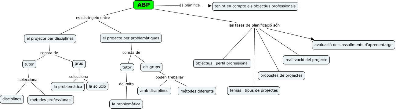 Este Cmap, tiene información relacionada con: Aprenentatge Basat en Projectes, grup selecciona la problemàtica, tutor selecciona métodes professionals, ABP es planifica tenint en compte els objectius professionals, ABP las fases de planificació són propostes de projectes, el projecte per problemàtiques consta de els grups, els grups poden treballar métodes diferents, ABP las fases de planificació són temas i tipus de projectes, grup selecciona la solució, ABP las fases de planificació són avaluació dels assoliments d'aprenentatge, el projecte per problemàtiques consta de tutor, tutor delimita la problemàtica, el projecte per disciplines consta de tutor, ABP es distingeix entre el projecte per problemàtiques, ABP es distingeix entre el projecte per disciplines, el projecte per disciplines consta de grup, els grups poden treballar amb disciplines, tutor selecciona disciplines, ABP las fases de planificació són objectius i perfil professional, ABP las fases de planificació són realització del projecte