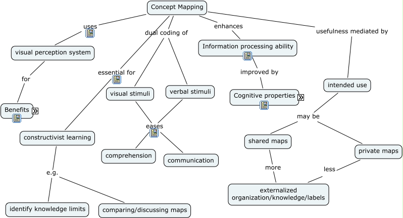 Processing Features, Concept Mapping uses visual perception system, shared maps more externalized organization/knowledge/labels, Concept Mapping usefulness mediated by intended use, Concept Mapping dual coding of visual stimuli, Information processing ability improved by Cognitive properties, constructivist learning e.g. comparing/discussing maps, visual stimuli eases communication, intended use may be private maps, visual perception system for Benefits, private maps less externalized organization/knowledge/labels