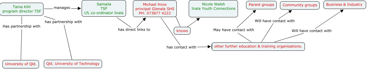 This Concept Map, created with IHMC CmapTools, has information related to: INALA CONTACTS, Samaila TSF LfL co-ordinator Inala has direct links to Michael Knox principal Glenala SHS PH: 073877 4222, Michael Knox principal Glenala SHS PH: 073877 4222 ???? knows, Tania Kihl program director TSF manages Samaila TSF LfL co-ordinator Inala, other further education & training organisations. May have contact with Parent groups, other further education & training organisations. Will have contact with Business & Industry, knows knows Nicole Walsh Inala Youth Connections, Tania Kihl program director TSF has partnership with Qld. University of Technology, other further education & training organisations. Will have contact with Community groups, Tania Kihl program director TSF Has partnership with University of Qld., Michael Knox principal Glenala SHS PH: 073877 4222 has contact with ?