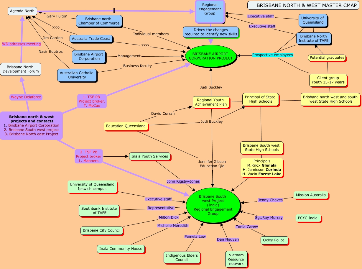 This Concept Map, created with IHMC CmapTools, has information related to: TOMS OVERVIEW, Regional Youth Achievement Plan Judi Buckley Principal of State High Schools, Brisbane North Institute of TAFE Prospective employees BRISBANE AIRPORT CORPORATION PROJECT, Brisbane City Council Milton Dick Brisbane South west Project (Inala) Regional Engagement Group, University of Queensland Ipswich campus Executive staff Brisbane South west Project (Inala) Regional Engagement Group, PCYC Inala Sgt.Ray Murray Brisbane South west Project (Inala) Regional Engagement Group, Indigenous Elders Council Pamela Law Brisbane South west Project (Inala) Regional Engagement Group, Regional Engagement Group Drives the changes required to identify new skills BRISBANE AIRPORT CORPORATION PROJECT, Brisbane South west State High Schools Principals M.Knox Glenala H. Jamieson Corinda H. Vacin Forest Lake Brisbane South west Project (Inala) Regional Engagement Group, Brisbane north west and south west State High Schools ???? Client group Youth 15-17 years, Brisbane South west Project (Inala) Regional Engagement Group Judi Buckley Principal of State High Schools, Brisbane Airport Corporation Management BRISBANE AIRPORT CORPORATION PROJECT, Regional Youth Achievement Plan Judi Buckley BRISBANE AIRPORT CORPORATION PROJECT, Inala Youth Services John Rigsby-Jones Brisbane South west Project (Inala) Regional Engagement Group, Brisbane North Development Forum WD adresses meeting Agenda North, Client group Youth 15-17 years Potential graduates Brisbane North Institute of TAFE, Australia Trade Coast ???? BRISBANE AIRPORT CORPORATION PROJECT, Principal of State High Schools Principals M.Knox Glenala H. Jamieson Corinda H. Vacin Forest Lake Brisbane South west Project (Inala) Regional Engagement Group, University of Queensland Executive staff Regional Engagement Group, Education Queensland Judi Buckley Principal of State High Schools, Brisbane north Chamber of Commerce Individual members BRISBANE AIRPORT CORPORATION PROJECT