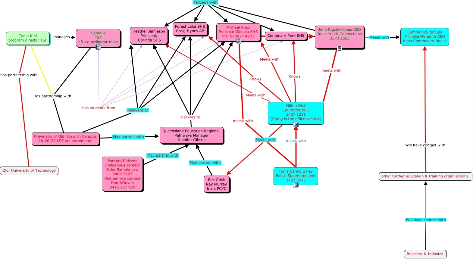 This Concept Map, created with IHMC CmapTools, has information related to: Inala local area core connectors, Parents/Citizens Indigenous contact Elder Pamela Law 3489 3223 Vietnamese contact Dan NGuyen 0416 137 929 May partner with Queensland Education Regional Pathways Manager Jennifer Gibson, John Rigsby-Jones CEO Inala Youth Connections 3372 2655 meets with Milton Dick Councillor BCC 3407 1211 (Cathy is the office contact), other further education & training organisations. Will have contact with Community groups Michelle Meredith CEO Inala Community House, Queensland Education Regional Pathways Manager Jennifer Gibson Delivers to Michael Knox Principal Glenala SHS PH: 073877 4222, John Rigsby-Jones CEO Inala Youth Connections 3372 2655 Meets with Community groups Michelle Meredith CEO Inala Community House, Tania Kihl program director TSF has partnership with Qld. University of Technology, Tonia Carew Oxley Police Superintendent 3737 5573 meets with Milton Dick Councillor BCC 3407 1211 (Cathy is the office contact), Michael Knox Principal Glenala SHS PH: 073877 4222 Meets with John Rigsby-Jones CEO Inala Youth Connections 3372 2655, Tania Kihl program director TSF manages Samaila TSF LfL co-ordinator Inala, Milton Dick Councillor BCC 3407 1211 (Cathy is the office contact) Meets with Michael Knox Principal Glenala SHS PH: 073877 4222, Queensland Education Regional Pathways Manager Jennifer Gibson Delivers to Forest Lake SHS Craig Hynes AP, Samaila TSF LfL co-ordinator Inala has students from Michael Knox Principal Glenala SHS PH: 073877 4222, Michael Knox Principal Glenala SHS PH: 073877 4222 meets with Tonia Carew Oxley Police Superintendent 3737 5573, Queensland Education Regional Pathways Manager Jennifer Gibson Delivers to Heather Jamieson Principal, Corinda SHS, Tania Kihl program director TSF Has partnership with University of Qld. Ipswich Campus 20;20;20 LSE uni enrolments, John Rigsby-Jones CEO Inala Youth Connections 3372 2655 Partners with Forest Lake SHS Craig Hynes AP, University of Qld. Ipswich Campus 20;20;20 LSE uni enrolments Relevant to Heather Jamieson Principal, Corinda SHS, Milton Dick Councillor BCC 3407 1211 (Cathy is the office contact) Meets with Heather Jamieson Principal, Corinda SHS, John Rigsby-Jones CEO Inala Youth Connections 3372 2655 Partners with Centenary Park SHS, University of Qld. Ipswich Campus 20;20;20 LSE uni enrolments Relevant to Michael Knox Principal Glenala SHS PH: 073877 4222