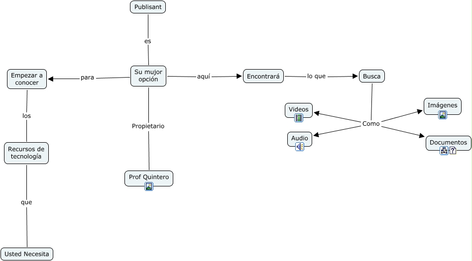 Aquest mapa conceptual conté informació relacionada amb: Publisant, Encontrará lo que Busca, Busca Como Videos, Publisant es Su mujor opción, Recursos de tecnología que Usted Necesita, Su mujor opción aquí Encontrará, Busca Como Documentos, Busca Como Audio, Su mujor opción Propietario Prof Quintero, Su mujor opción para Empezar a conocer, Empezar a conocer los Recursos de tecnología, Busca Como Imágenes