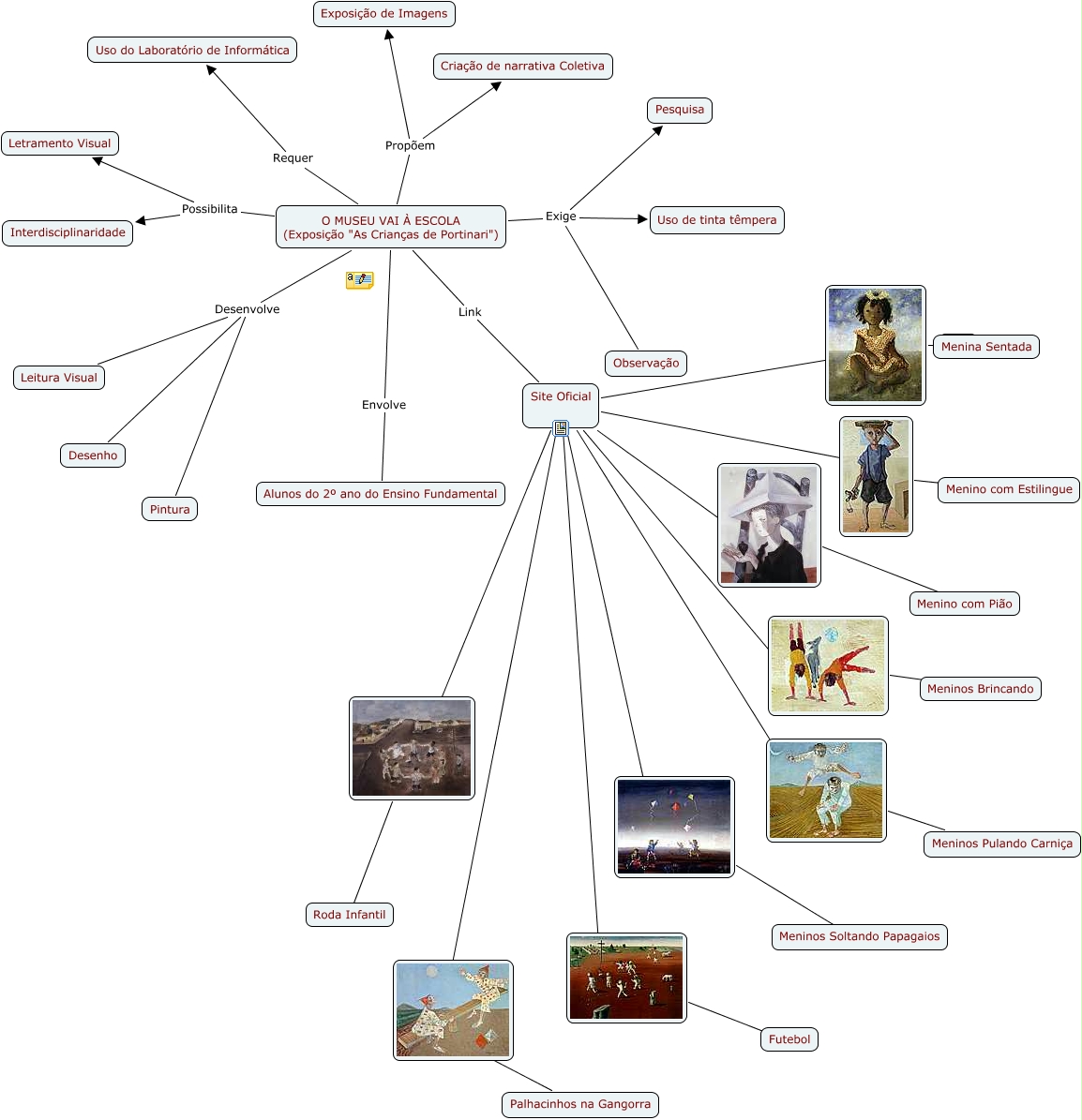 Esse mapa conceitual, produzido no IHMC CmapTools, tem a informação relacionada a: OBJETO DE APRENDIZAGEM, ???? Menino com Estilingue, ???? Meninos Pulando Carniça, ???? Menino com Pião, Site Oficial ????, Site Oficial ????, O MUSEU VAI À ESCOLA (Exposição "As Crianças de Portinari") Propõem Criação de narrativa Coletiva, Site Oficial ????, Site Oficial ????, O MUSEU VAI À ESCOLA (Exposição "As Crianças de Portinari") Exige Uso de tinta têmpera, O MUSEU VAI À ESCOLA (Exposição "As Crianças de Portinari") Envolve Alunos do 2º ano do Ensino Fundamental, ???? Palhacinhos na Gangorra, Site Oficial ????, O MUSEU VAI À ESCOLA (Exposição "As Crianças de Portinari") Link Site Oficial, O MUSEU VAI À ESCOLA (Exposição "As Crianças de Portinari") Requer Uso do Laboratório de Informática, Site Oficial ????, O MUSEU VAI À ESCOLA (Exposição "As Crianças de Portinari") Possibilita Interdisciplinaridade, Site Oficial ????, ???? Meninos Brincando, O MUSEU VAI À ESCOLA (Exposição "As Crianças de Portinari") Desenvolve Desenho, ???? Futebol