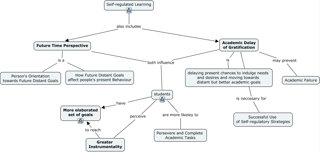 This Concept Map, created with IHMC CmapTools, has information related to: future-perspective-delay-gratification, students are more likeley to Persevere and Complete Academic Tasks, Academic Delay of Gratification is neccesary for Successful Use of Self-regulatory Strategies, Greater Instrumentality to reach More elaborated set of goals, Academic Delay of Gratification is delaying present chances to indulge needs and desires and moving towards distant but better academic goals, Self-regulated Learning also includes Academic Delay of Gratification, Future Time Perspective is a How Future Distant Goals affect people's present Behaviour, Future Time Perspective both influence students, Self-regulated Learning also includes Future Time Perspective, Academic Delay of Gratification both influence students, Academic Delay of Gratification may prevent Academic Failure, students perceive Greater Instrumentality, students have More elaborated set of goals, Future Time Perspective is a Person's Orientation towards Future Distant Goals