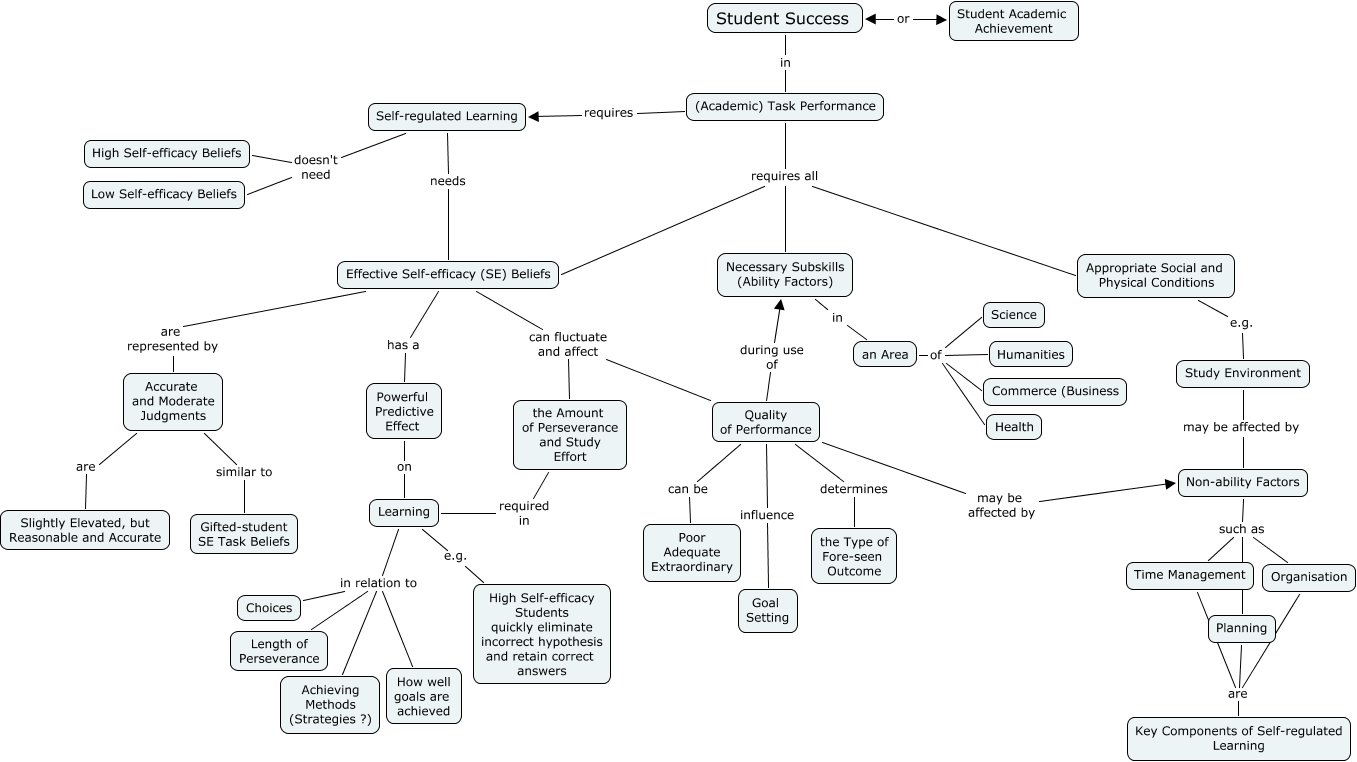 This Concept Map, created with IHMC CmapTools, has information related to: Student-Success-WEBSITE-CONTENT, Time Management are Key Components of Self-regulated Learning, Quality of Performance during use of Necessary Subskills (Ability Factors), Powerful Predictive Effect on Learning, Study Environment may be affected by Non-ability Factors, (Academic) Task Performance requires all Appropriate Social and Physical Conditions, Learning in relation to How well goals are achieved, Effective Self-efficacy (SE) Beliefs can fluctuate and affect Quality of Performance, Effective Self-efficacy (SE) Beliefs has a Powerful Predictive Effect, Quality of Performance influence Goal Setting, Student Success in (Academic) Task Performance, (Academic) Task Performance requires all Effective Self-efficacy (SE) Beliefs, Accurate and Moderate Judgments similar to Gifted-student SE Task Beliefs, Effective Self-efficacy (SE) Beliefs are represented by Accurate and Moderate Judgments, (Academic) Task Performance requires all Necessary Subskills (Ability Factors), Learning in relation to Choices, Non-ability Factors such as Planning, an Area of Health, Accurate and Moderate Judgments are Slightly Elevated, but Reasonable and Accurate, Quality of Performance determines the Type of Fore-seen Outcome, Effective Self-efficacy (SE) Beliefs can fluctuate and affect the Amount of Perseverance and Study Effort