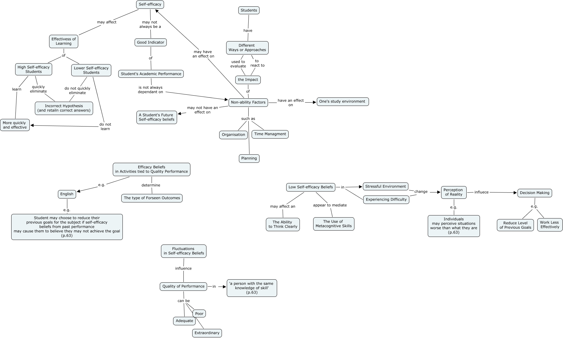 This Concept Map, created with IHMC CmapTools, has information related to: selfEfficacy-as-indicator, Fluctuations in Self-efficacy Beliefs influence Quality of Performance, High Self-efficacy Students quickly eliminate Incorrect Hypothesis (and retailn correct answers), Lower Self-efficacy Students do not quickly eliminate Incorrect Hypothesis (and retailn correct answers), Efficacy Beliefs in Activities tied to Quality Performance e.g. English, Self-efficacy may not always be a Good Indicator, Different Ways or Approaches used to evaluate the Impact, Student's Academic Performance is not always dependant on Non-ability Factors, Perception of Reality influece Decision Making, Self-efficacy may affect Effectivess of Learning, Perception of Reality e.g. Individuals may perceive situations worse than what they are (p.63), Students have Different Ways or Approaches, Lower Self-efficacy Students do not learn More quickly and effective, Quality of Performance in 'a person with the same knowledge of skill' (p.63), Quality of Performance can be Poor, Effectivess of Learning of Lower Self-efficacy Students, Low Self-efficacy Beliefs may affect an The Ability to Think Clearly, Quality of Performance can be Extraordinary, Experiencing Difficulty change Perception of Reality, English e.g. Student may choose to reduce their previous goals for the subject if self-efficacy beliefs from past performance may cause them to believe they may not achieve the goal (p.63), Low Self-efficacy Beliefs in Experiencing Difficulty