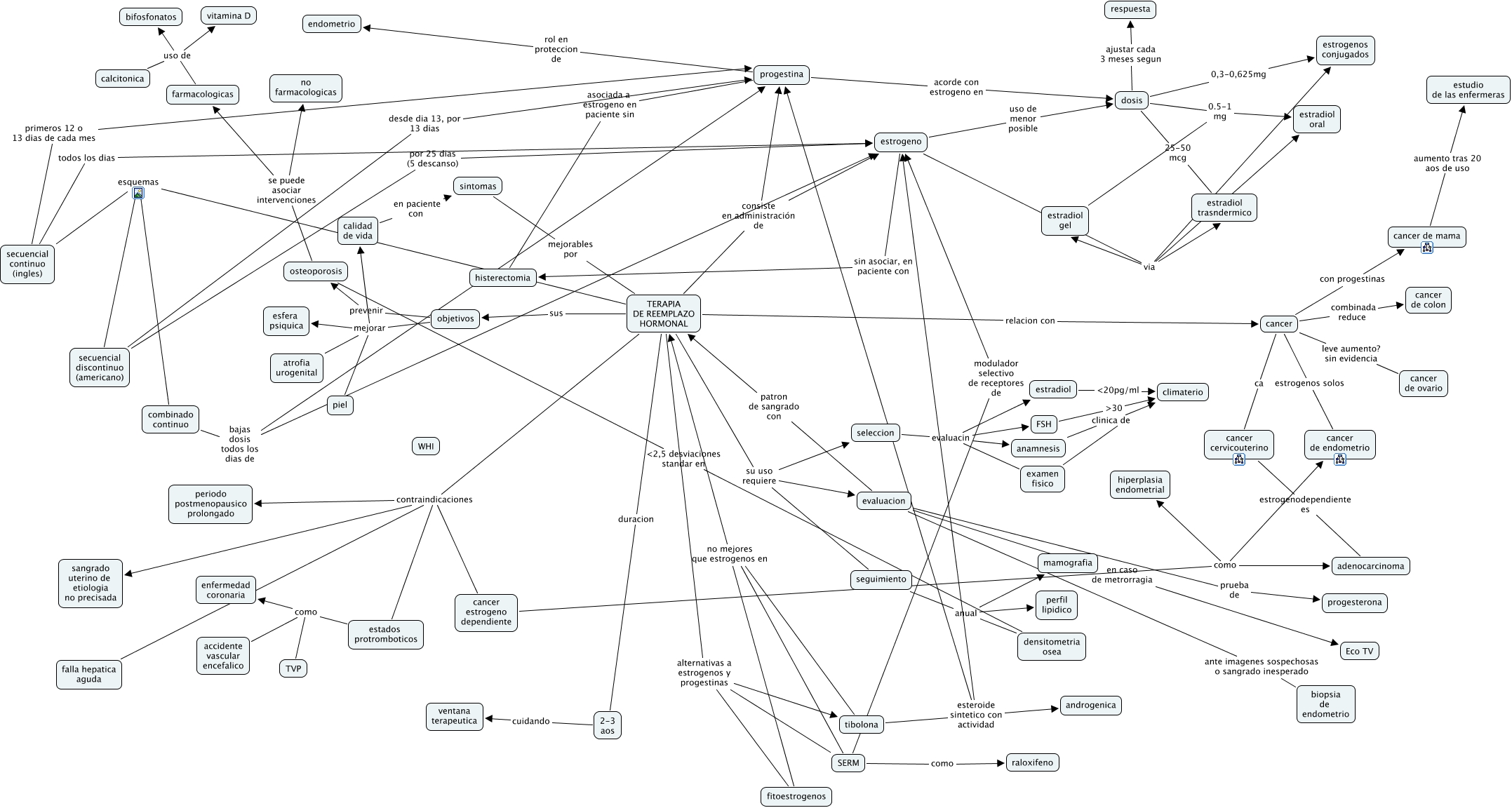 Este Cmap, tiene información relacionada con: terapia de reemplazo hormonal, TERAPIA DE REEMPLAZO HORMONAL contraindicaciones sangrado uterino de etiologia no precisada, tibolona esteroide sintetico con actividad progestina, combinado continuo bajas dosis todos los dias de estrogeno, evaluacion ante imagenes sospechosas o sangrado inesperado biopsia de endometrio, estados protromboticos como accidente vascular encefalico, estradiol ងpg/ml climaterio, FSH ᡖ climaterio, TERAPIA DE REEMPLAZO HORMONAL consiste en administración de estrogeno, seleccion evaluacin estradiol, objetivos mejorar piel, objetivos mejorar esfera psiquica, cancer estrogenos solos cancer de endometrio, estrogeno via estrogenos conjugados, secuencial continuo (ingles) todos los dias estrogeno, farmacologicas uso de bifosfonatos, cancer ca cancer cervicouterino, secuencial discontinuo (americano) por 25 dias (5 descanso) estrogeno, seguimiento anual densitometria osea, objetivos mejorar atrofia urogenital, cancer cervicouterino estrogenodependiente es adenocarcinoma