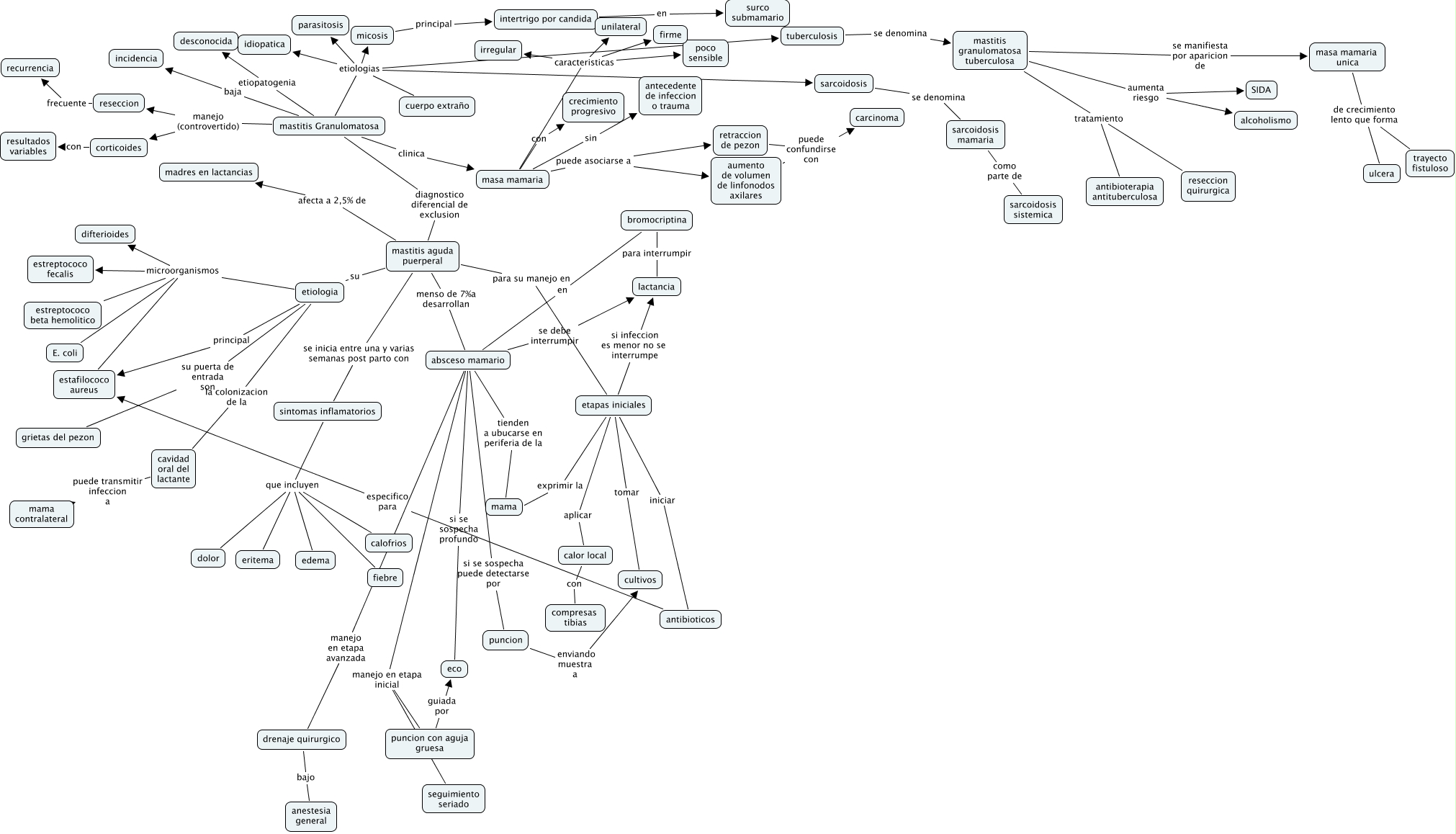 Este Cmap, tiene información relacionada con: mastitis e infecciones mamarias, cavidad oral del lactante puede transmitir infeccion a mama contralateral, tuberculosis se denomina mastitis granulomatosa tuberculosa, mastitis Granulomatosa clinica masa mamaria, masa mamaria unica de crecimiento lento que forma trayecto fistuloso, mastitis Granulomatosa manejo (controvertido) reseccion, retraccion de pezon puede confundirse con carcinoma, masa mamaria caracteristicas poco sensible, etapas iniciales iniciar antibioticos, mastitis Granulomatosa etiopatogenia desconocida, antibioticos especifico para estafilococo aureus, mastitis Granulomatosa etiologias micosis, absceso mamario si se sospecha profundo eco, masa mamaria puede asociarse a retraccion de pezon, etapas iniciales tomar cultivos, absceso mamario manejo en etapa inicial seguimiento seriado, mastitis granulomatosa tuberculosa tratamiento antibioterapia antituberculosa, etiologia microorganismos difterioides, absceso mamario manejo en etapa inicial puncion con aguja gruesa, etiologia microorganismos estreptococo fecalis, mastitis Granulomatosa etiologias parasitosis