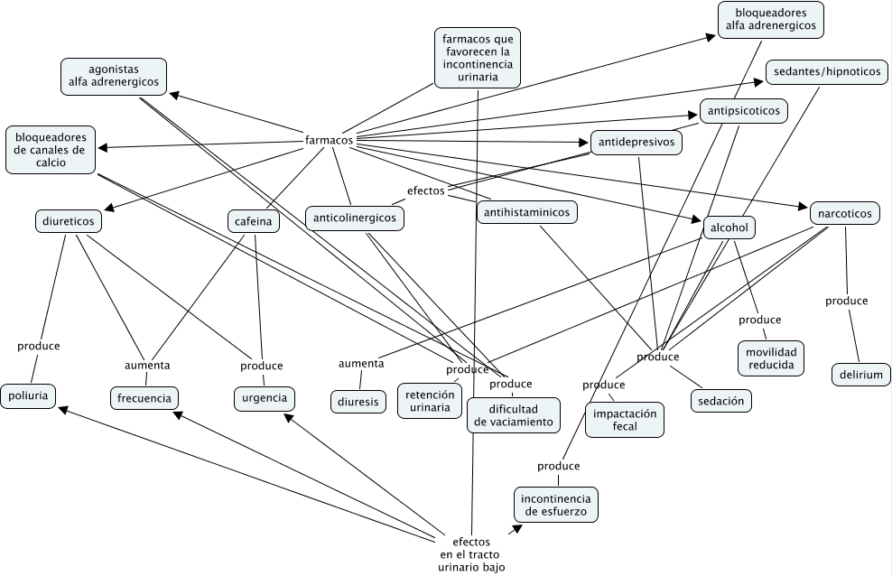 Este Cmap, tiene información relacionada con: farmacos, alcohol aumenta diuresis, farmacos que favorecen la incontinencia urinaria farmacos bloqueadores de canales de calcio, narcoticos produce delirium, antidepresivos efectos anticolinergicos, antidepresivos produce sedación, farmacos que favorecen la incontinencia urinaria farmacos agonistas alfa adrenergicos, farmacos que favorecen la incontinencia urinaria farmacos sedantes/hipnoticos, farmacos que favorecen la incontinencia urinaria farmacos diureticos, agonistas alfa adrenergicos produce retención urinaria, sedantes/hipnoticos produce sedación, farmacos que favorecen la incontinencia urinaria farmacos narcoticos, diureticos aumenta frecuencia, anticolinergicos produce retención urinaria, farmacos que favorecen la incontinencia urinaria farmacos anticolinergicos, agonistas alfa adrenergicos produce dificultad de vaciamiento, antipsicoticos produce sedación, farmacos que favorecen la incontinencia urinaria efectos en el tracto urinario bajo urgencia, farmacos que favorecen la incontinencia urinaria farmacos bloqueadores alfa adrenergicos, farmacos que favorecen la incontinencia urinaria farmacos antidepresivos, cafeina aumenta frecuencia